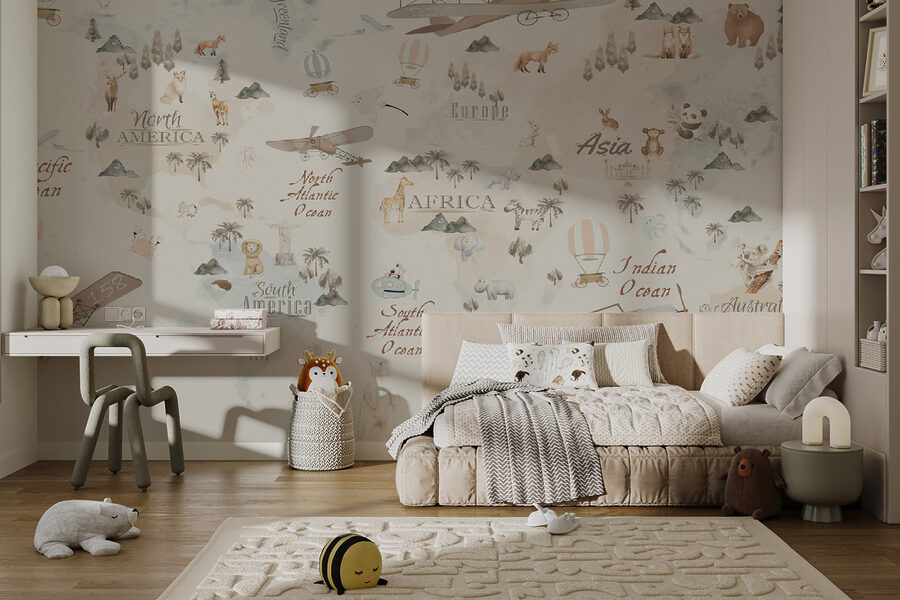 Stellen Sie sich vor, Sie verwandeln das Zimmer Ihres Kindes in ein traumhaftes Abenteuer! Dieses Wandbild “Vintage Map with Animals & Aircrafts” ist pure Magie und definitiv nicht nur für Kinder. Sie hat einen wundervollen Charme der alten Welt, gemischt mit skurrilen Elementen – Heißluftballons, charmante Tiere und alte Flugzeuge. Auch Sie werden sich darin verlieren!