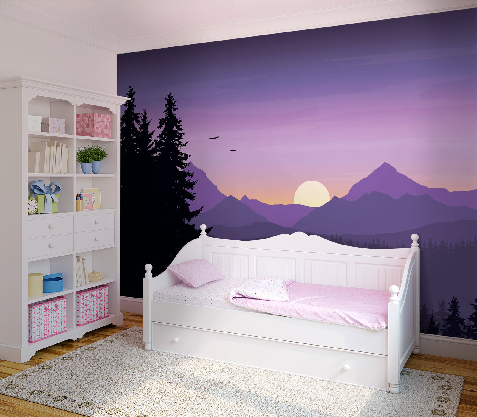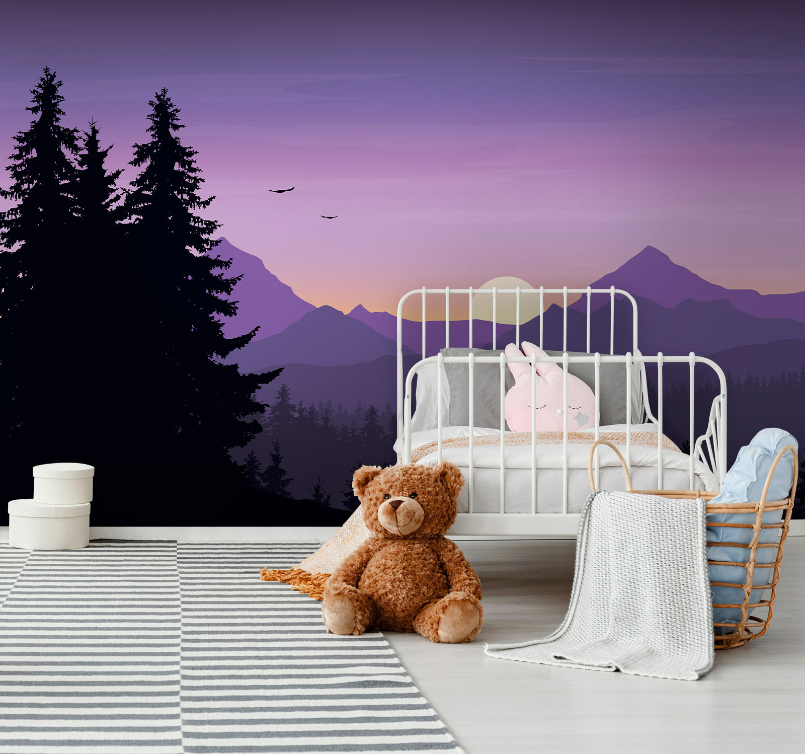 Stellen Sie sich vor, Sie betreten einen gemütlichen Rückzugsort, umgeben von der ruhigen Schönheit der Natur – ohne jemals Ihr Zuhause zu verlassen. Diese Wandtapete mit einer atemberaubenden Landschaft aus Bäumen und Bergen bringt diesen Traum direkt an Ihre Wände. Sanfte Violetttöne tanzen über den Himmel, während die Sonne untergeht und einen bezaubernden Schein wirft. Es ist wie Ihr eigener friedlicher Rückzugsort, an dem der Stress einfach dahinschmilzt. Stellen Sie sich vor, Sie machen es sich mit einem guten Buch gemütlich oder tauschen Geschichten mit Freunden aus, während Sie diese ruhige Aussicht genießen. Jeder Blick auf diese majestätischen Berge und hohen Bäume könnte Sie zu einem kleinen Abenteuer inspirieren – oder zumindest zum Träumen davon. Perfekt für Naturliebhaber und alle, die ihrem Zuhause einen Hauch von Ruhe verleihen möchten. Warum lassen Sie nicht Ihre Wände sprechen? Denn wer würde nicht gerne ein Stück Natur in sein Zuhause holen?