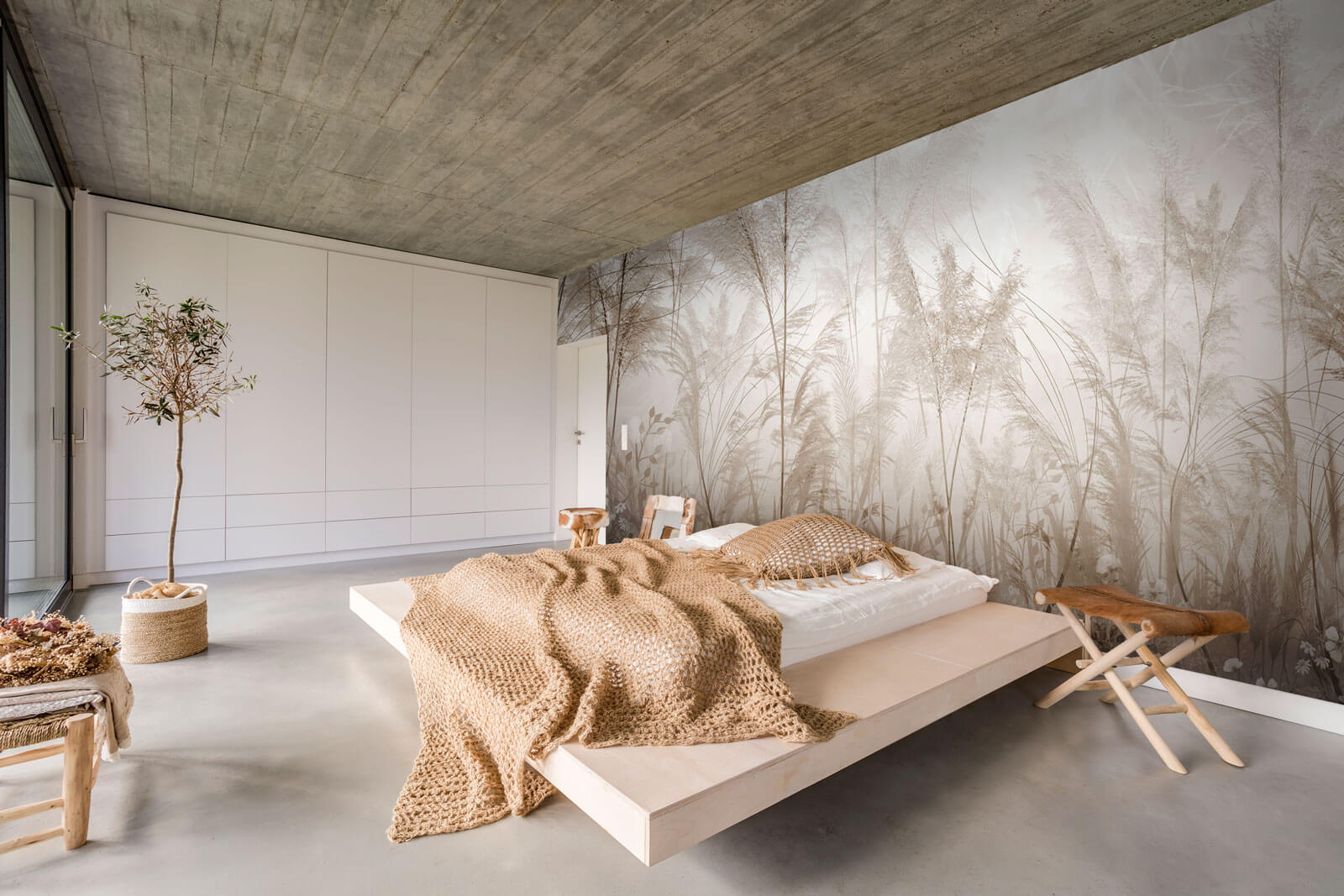 Die erdigen Töne dieses Wandbildes bilden einen beruhigenden Hintergrund, der sich leicht mit Ihrer Lieblingseinrichtung kombinieren lässt. Stellen Sie sich vor, wie Sie mit einer dampfenden Tasse Tee in der Hand in einen bequemen Sessel sinken und sich ganz in ein gutes Buch vertiefen. Die subtile Schönheit des Grases tanzt spielerisch im Licht, und vielleicht, nur vielleicht, regt es zu einem Moment der Tagträumerei an. Es ist die Art von Kunst, die eine einfache Wand wie eine Szene aus einer friedlichen Landschaft erscheinen lässt. Verleihen Sie Ihren Wänden einen Hauch von frischer Luft!