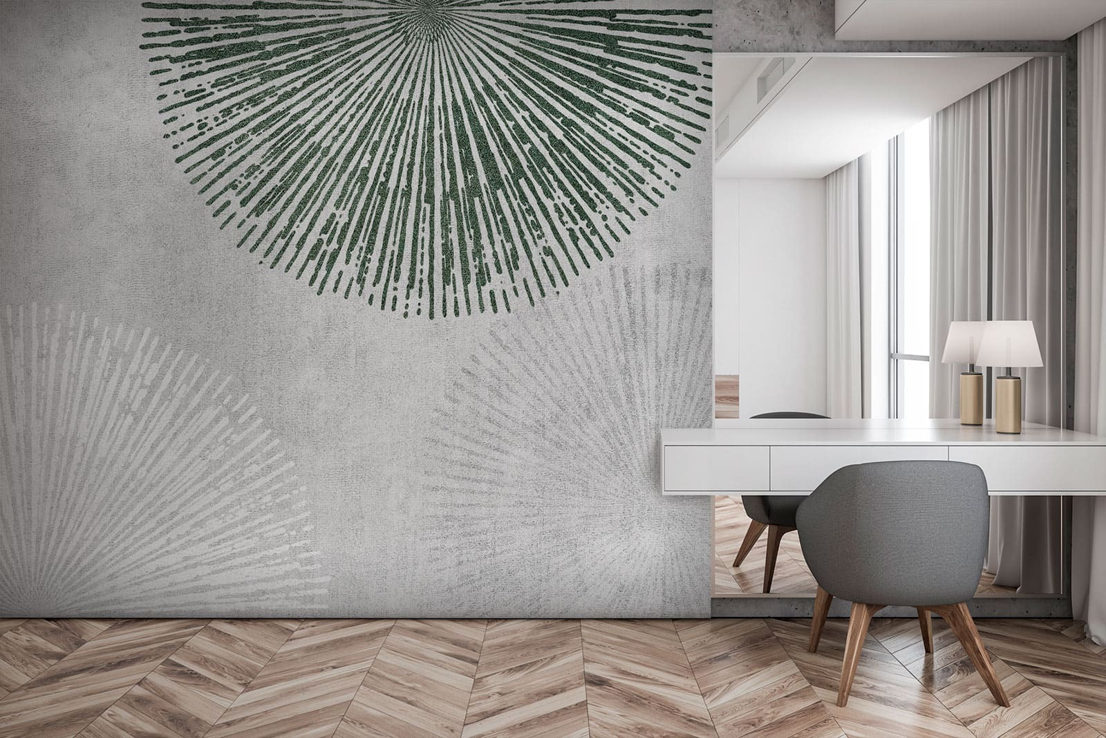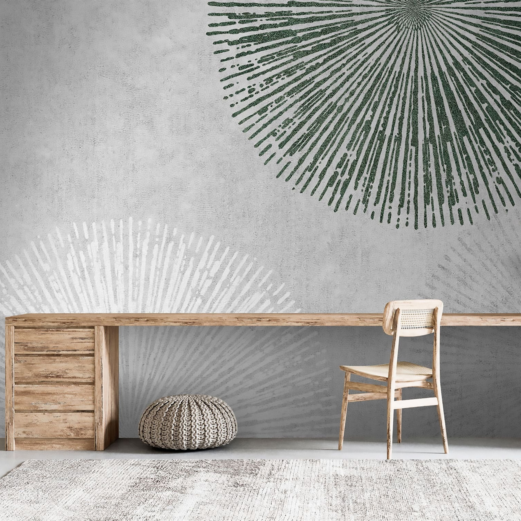 Verwandeln Sie Ihren Raum mit dieser fesselnden Fototapete mit verspielten radialen Mustern vor einem einzigartigen Hintergrund. Stellen Sie sich vor: Ein Wohnzimmer, das plötzlich weniger wie die alte Junggesellenbude Ihres Cousins und mehr wie ein künstlerisches Café in der Stadt aussieht. Die sanften Grün- und Weißtöne schaffen eine friedliche Atmosphäre, die es leicht macht, sich nach einem langen Tag zu entspannen. Die Gäste werden von der Neugierde gepackt. Es ist wie ein Flirt mit der Geometrie – kühn, lustig und doch mühelos stilvoll. Vielleicht ertappt man sich dabei, wie man vor sich hin träumt, weil jedes kleine Detail die Fantasie anregt. Perfekt für alle, die sich einen schicken Twist ohne viel Aufhebens wünschen.