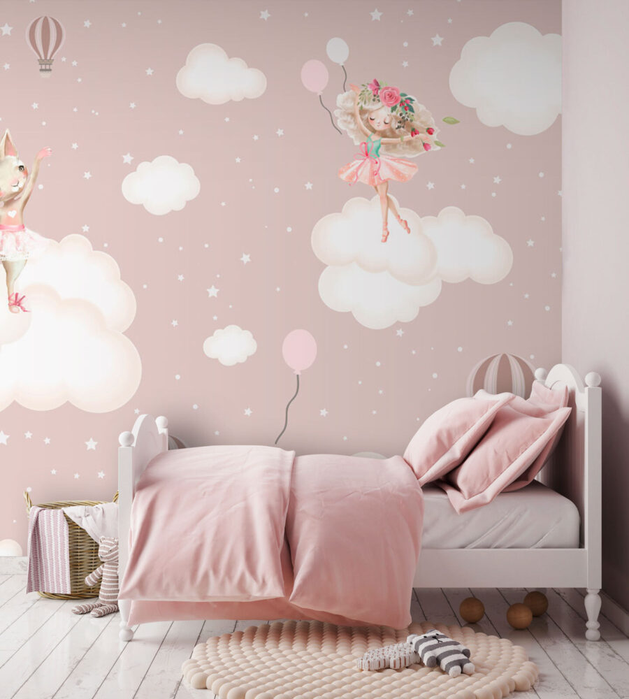 “Fototapeten Ballet Animals Dancing on Clouds” ist eine reizvolle Ergänzung für jedes Kinderzimmer. Stellen Sie sich diese wunderlichen Momente vor, in denen Ballett auf Tagträume trifft – Sie haben Häschen in Tutus, Kätzchen, die perfekte Pirouetten drehen, und verträumte Luftballons, die vorbeischweben. Die weichen, pastellfarbenen Wolken und die bezaubernden Kreaturen erwecken ein Märchenbuch an Ihrer Wand zum Leben. Es ist perfekt für das Zimmer Ihrer kleinen Tänzerin und verleiht ihr einen Hauch von Magie und Eleganz.
