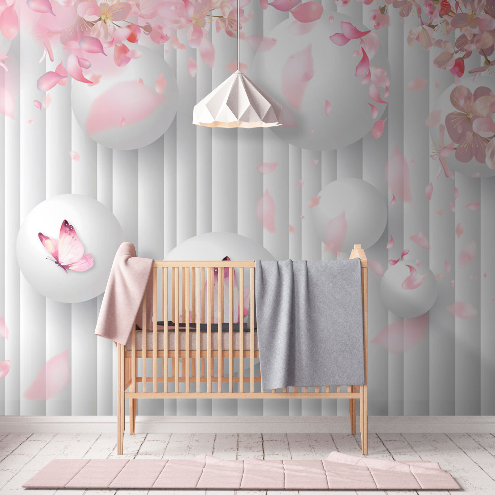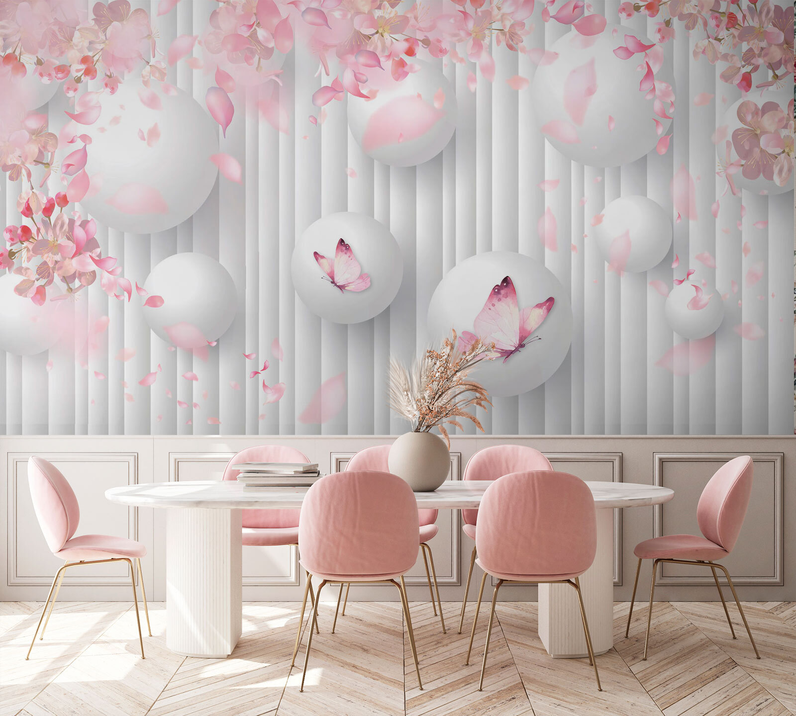 Verwandeln Sie diese schlichte Wand in ein Kunstwerk mit dieser bezaubernden Wandtapete, die einen verspielten Tanz weißer Kugeln zeigt, die mit charmanten rosa Schmetterlingen verziert sind. Stellen Sie sich vor, Sie trinken Ihren Morgenkaffee in einem Raum, der sich wie ein ruhiger japanischer Garten anfühlt, und jeder Blick auf die Wand schenkt Ihnen ein wenig Freude. Die sanft flatternden Blütenblätter wecken das angenehme Gefühl des Frühlings und sorgen für eine warme, fröhliche Atmosphäre. Es ist, als hätte man die Natur im Haus, nur ohne Pollenallergie! Perfekt für jeden Raum, der ein wenig Ruhe und Kreativität braucht – machen Sie sich bereit für jede Menge Komplimente! Diese Wandtapete ist nicht nur Dekoration, sie hebt auch die Stimmung.