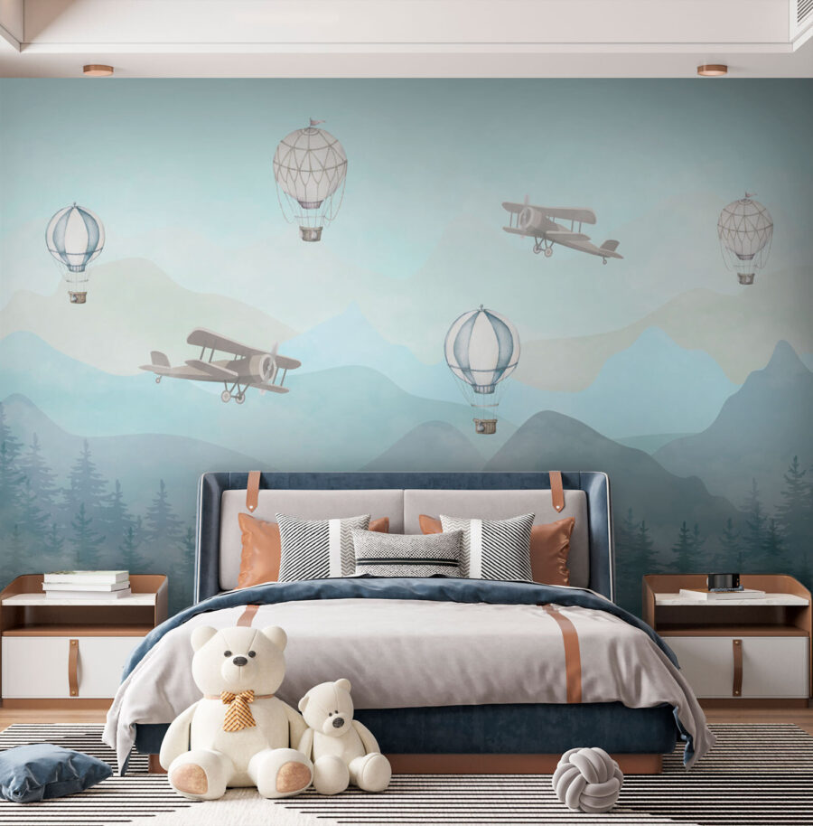 Stellen Sie sich vor, Sie wachen auf und sehen einen sanften, verträumten Himmel mit alten Flugzeugen und charmanten Heißluftballons, die über nebligen Bergen schweben. Diese Fototapete “Flugzeuge und Ballons über nebligen Bergen” ist wie eine Reise in ein heiteres Fantasieland. Perfekt für ein Kinderzimmer, verleiht es einen Hauch von Magie und Wunder und inspiriert kleine Abenteurer täglich. Denken Sie an beruhigende Geschichten vor dem Schlafengehen oder an Tagträume am Morgen. Die pastellfarbenen Töne sind angenehm für die Augen und geben jedem Raum das Gefühl einer sanften Flucht in die Fantasie. Absolut reizvoll, oder? Eine entzückende Mischung aus Zauber und Ruhe, die Freude und Neugierde weckt.
