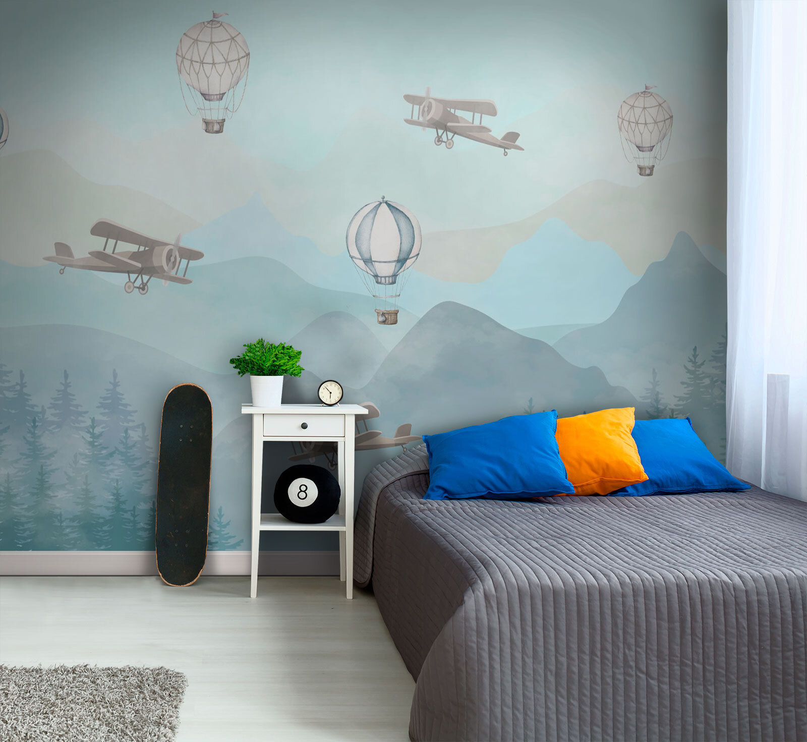 Stellen Sie sich vor, Sie wachen auf und sehen einen sanften, verträumten Himmel mit alten Flugzeugen und charmanten Heißluftballons, die über nebligen Bergen schweben. Diese Fototapete “Flugzeuge und Ballons über nebligen Bergen” ist wie eine Reise in ein heiteres Fantasieland. Perfekt für ein Kinderzimmer, verleiht es einen Hauch von Magie und Wunder und inspiriert kleine Abenteurer täglich. Denken Sie an beruhigende Geschichten vor dem Schlafengehen oder an Tagträume am Morgen. Die pastellfarbenen Töne sind angenehm für die Augen und geben jedem Raum das Gefühl einer sanften Flucht in die Fantasie. Absolut reizvoll, oder? Eine entzückende Mischung aus Zauber und Ruhe, die Freude und Neugierde weckt.