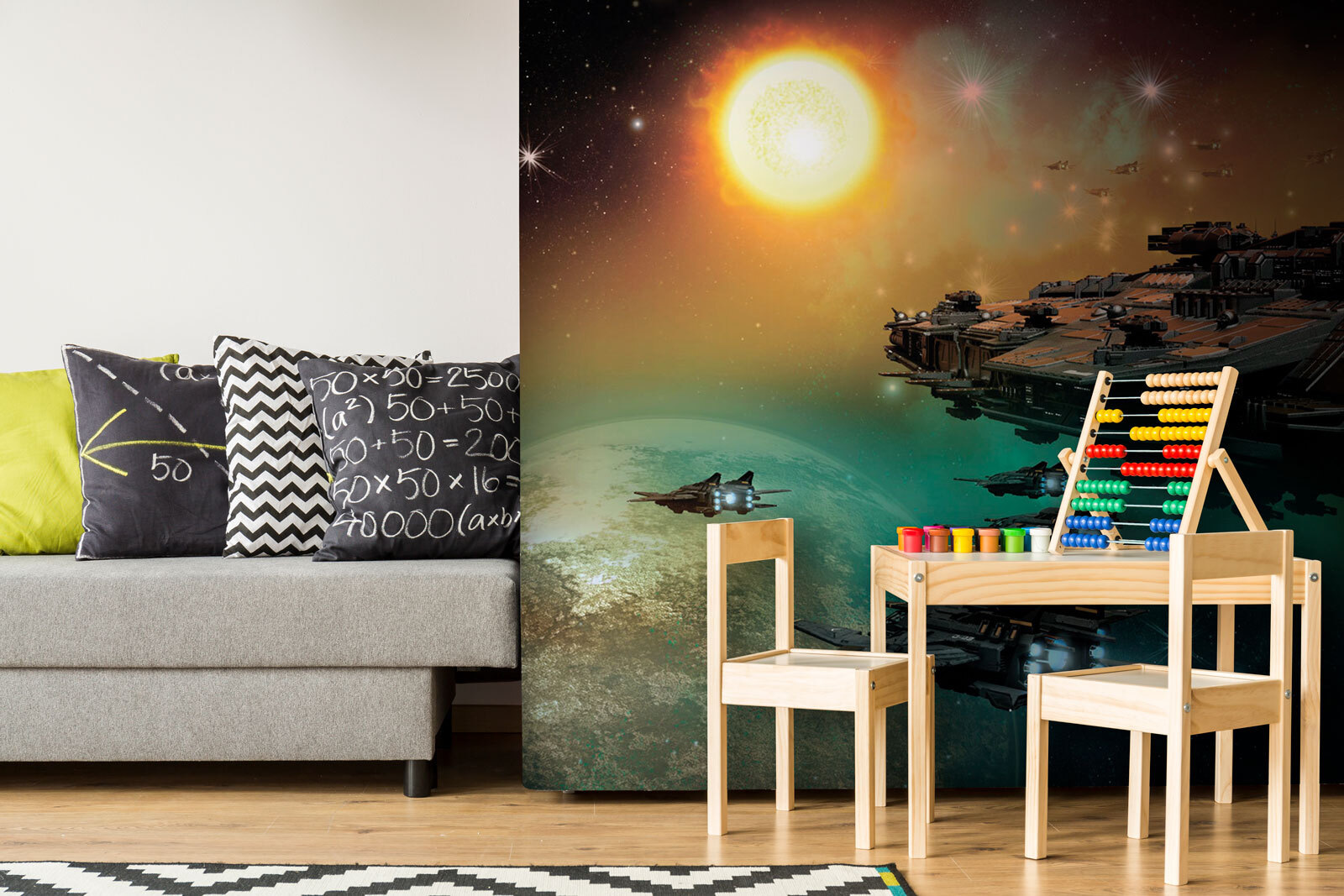 Perfekt für das Arbeitszimmer eines jeden Weltraumliebhabers oder das Zimmer Ihres Kindes – die detaillierten Raumschiffe, die leuchtende Sonne und die fernen Planeten lassen den Raum wie eine Szene aus einem Science-Fiction-Blockbuster wirken. Es hat diese magische Ausstrahlung, die dich von weit, weit entfernten Galaxien träumen lässt. Außerdem ist es doch viel cooler, als einfach nur auf eine Wand zu starren, oder? Man kann fast das Brummen der Triebwerke hören und den Nervenkitzel der Weltraumforschung spüren. Im Ernst, vielleicht inspiriert dich das ja dazu, Astronaut zu werden … oder zumindest deine Lieblingsfilme über den Weltraum noch einmal zu sehen. Holen Sie sich ein Stückchen Universum in Ihren Alltag – holen Sie sich die Sterne nach Hause!