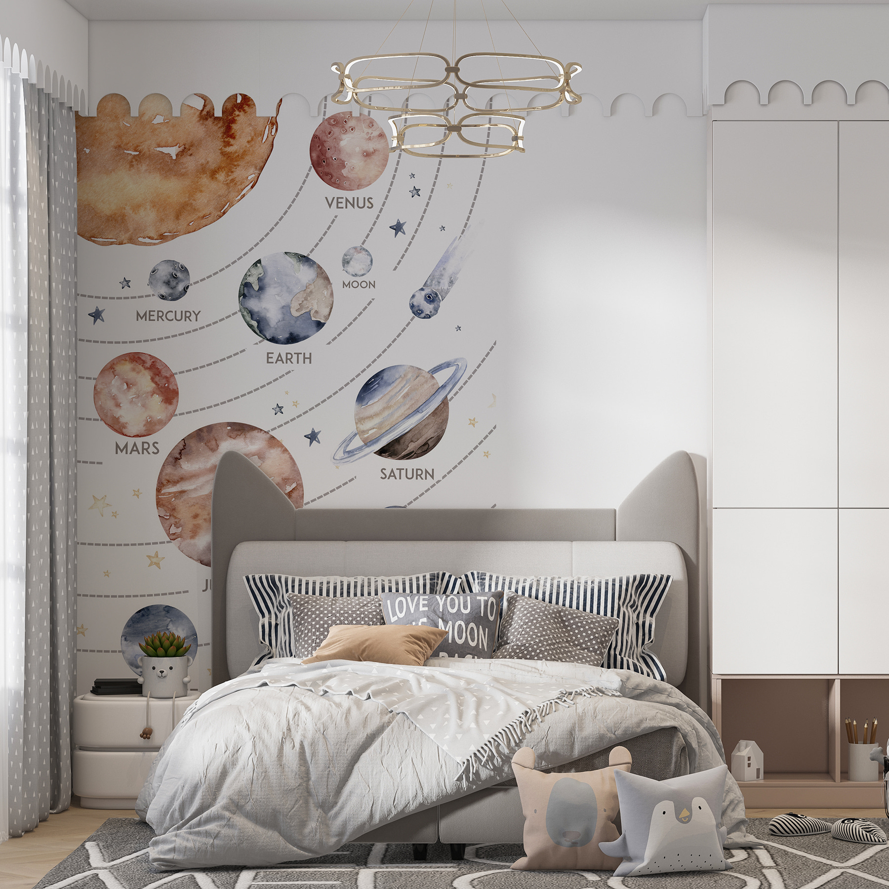 Stellen Sie sich vor, wie Sie unter dem sanften Schein der Saturnringe einschlafen oder mit Merkur und Jupiter spielen, die Wache halten. Es hat diese beruhigende künstlerische Ausstrahlung, die sich einfach richtig anfühlt – hier gibt es keine steifen, langweiligen Lernposter. Es ist einfach ein wunderschönes, einzigartiges Stück, das einen Hauch von galaktischem Zauber in Ihr Zuhause bringt. Egal, ob Sie ein Kinderzimmer verschönern oder einem Spielzimmer Charme verleihen wollen, dieses Wandbild ist eine hervorragende Wahl. 🌟