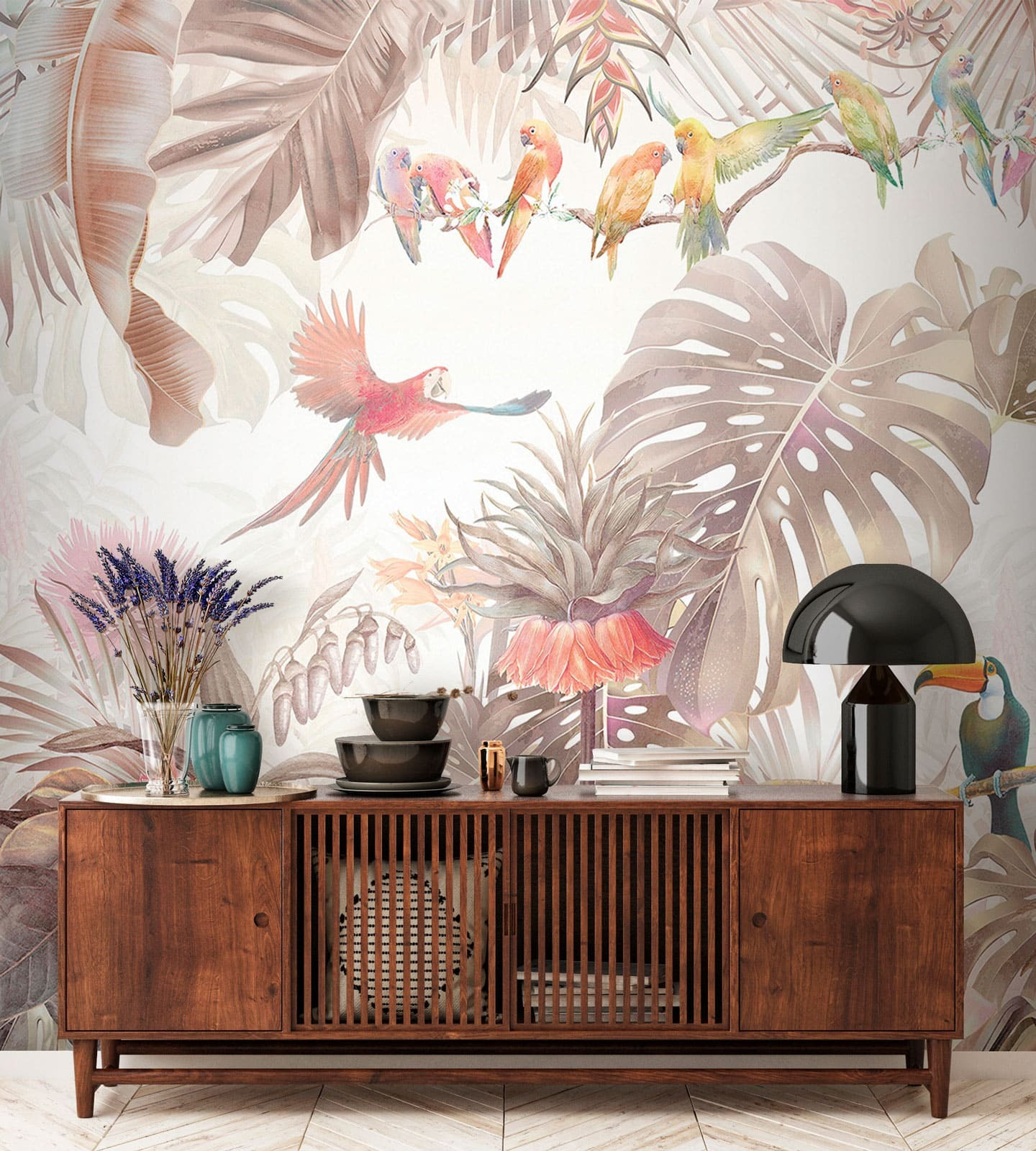 Hallo zusammen! Stellen Sie sich vor: eine atemberaubende Wandmalerei mit tropischen Vögeln, die inmitten von üppigem Grün chillen. Es ist wie ein kleines Stück vom Paradies direkt in deinem Wohnzimmer. Stellen Sie sich vor, Sie kommen nach einem langen Tag nach Hause und werden von lebhaften Papageien und Tukanen begrüßt, die in exotischem Laub eingebettet sind. Es ist nicht nur eine Wand – es ist eine kleine Flucht in einen tropischen Wald!