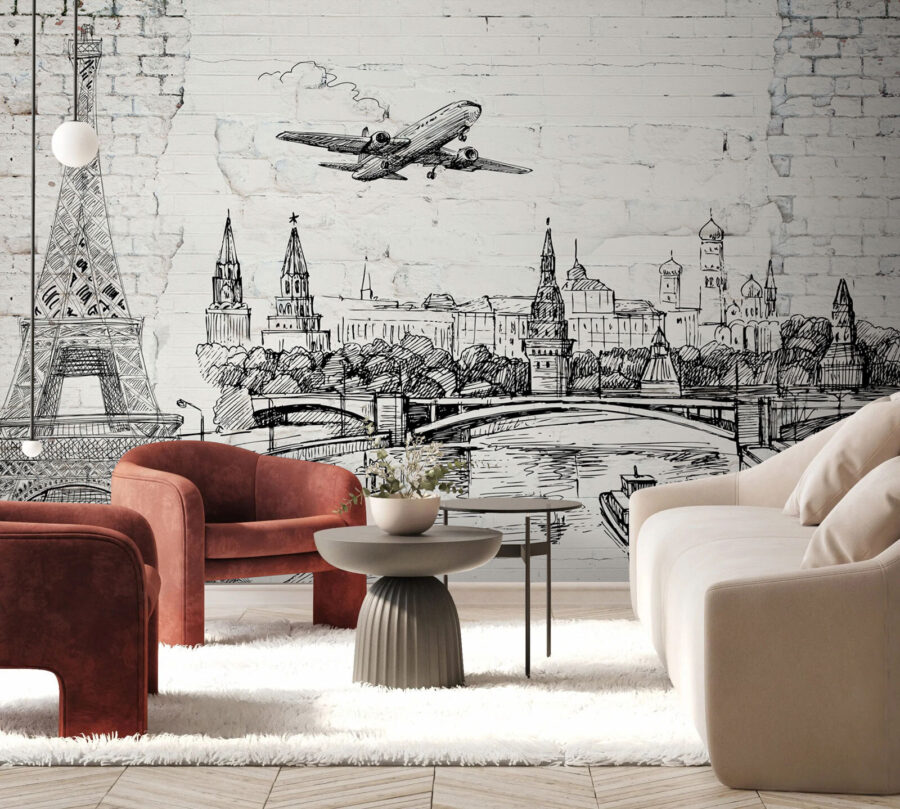 Verwandeln Sie eine schlichte Wand in einen Gesprächsaufhänger mit dieser auffälligen Wandtapete, die ein Stadtbild im Skizzenstil und eine ikonische Brücke zeigt. Es ist, als würde man jedes Mal, wenn man den Raum betritt, einen Kurzurlaub machen – wer möchte nicht einen Blick auf den Eiffelturm und den Kreml genießen? Stellen Sie sich vor, Sie trinken Ihren Morgenkaffee, träumen von Reisen oder planen Ihr nächstes Abenteuer. Das schwarz-weiße Design sorgt für eine schicke Atmosphäre und lässt sich leicht mit jeder Einrichtung kombinieren. Außerdem weckt es garantiert Neugier – Ihre Freunde könnten denken, Sie seien gerade von einer rasanten Reise zurückgekommen! Ein Hauch von Kultur an Ihrer Wand – perfekt für alle, die Fernweh haben.