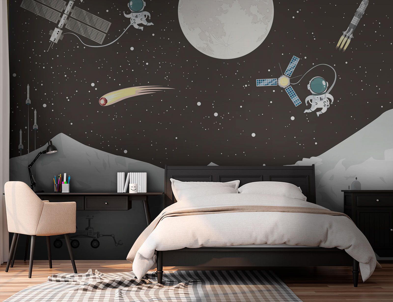 Haben Sie jemals davon geträumt, zwischen den Sternen zu schweben? Mit dieser Fototapete “Full Moon in the Sky” werden diese kosmischen Träume vielleicht wahr. Es ist perfekt für Träumer, Nachteulen und Weltraumfans und verwandelt jedes Zimmer in einen galaktischen Rückzugsort. Stellen Sie sich vor, Sie kommen nach einem langen Tag nach Hause, lassen sich auf die Couch fallen und haben das Gefühl, einen Sitzplatz in der ersten Reihe zum Universum zu haben. Es ist wie eine nächtliche Flucht, nur ohne das Raumschiff! Mondbeschienene Berge, umherschwebende Astronauten – all das vermittelt eine abenteuerliche und zugleich beruhigende Stimmung. Dieser Raum ist ideal für ein Kinderzimmer und könnte sogar den einen oder anderen zukünftigen Astronauten inspirieren! Es ist eine verspielte und doch heitere Ergänzung für jede Wand, die die Fantasie und den Sinn für Wunder anregt.