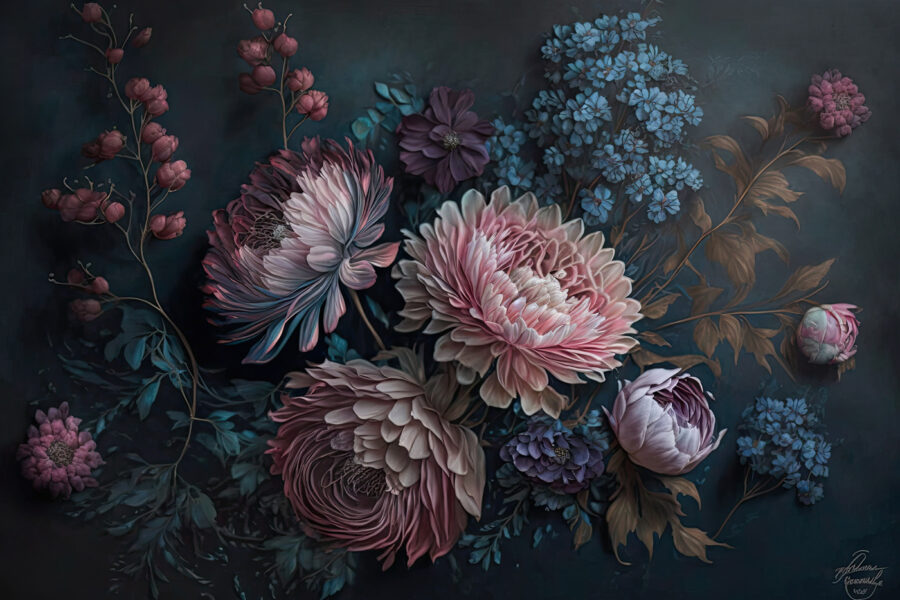 Fototapeten Lebendiges Blumenarrangement in dunklen Farbtönen Fototapeten Lebendiges Blumenarrangement in dunklen Farbtönen