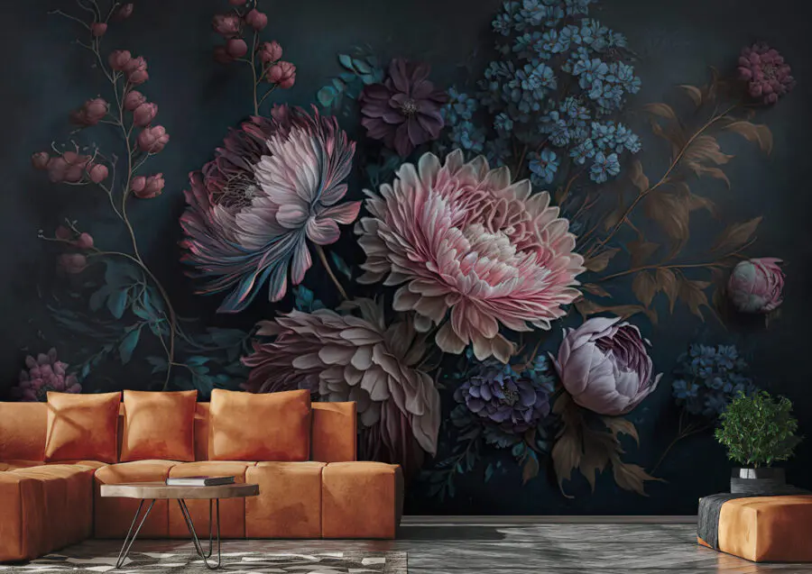 Fototapeten Lebendiges Blumenarrangement in dunklen Farbtönen Fototapeten Lebendiges Blumenarrangement in dunklen Farbtönen