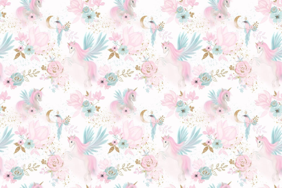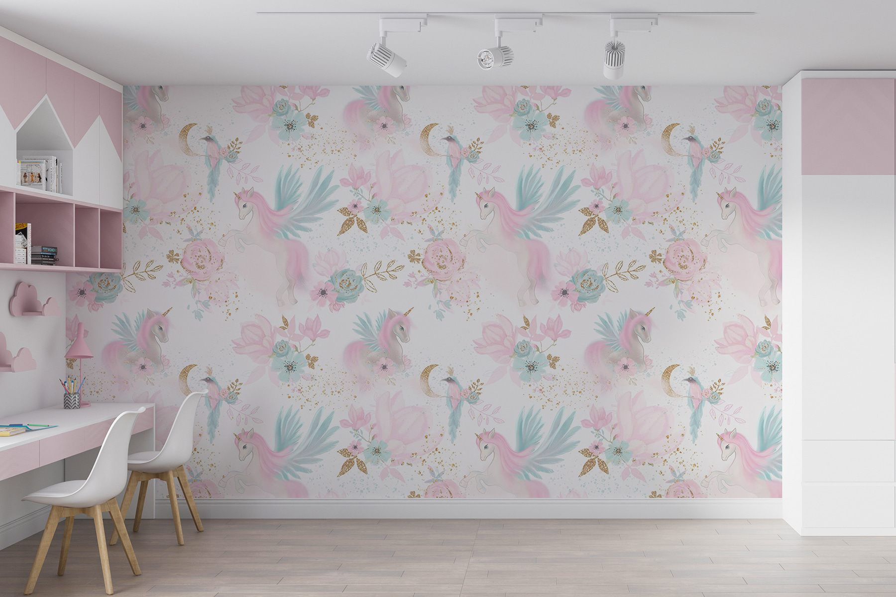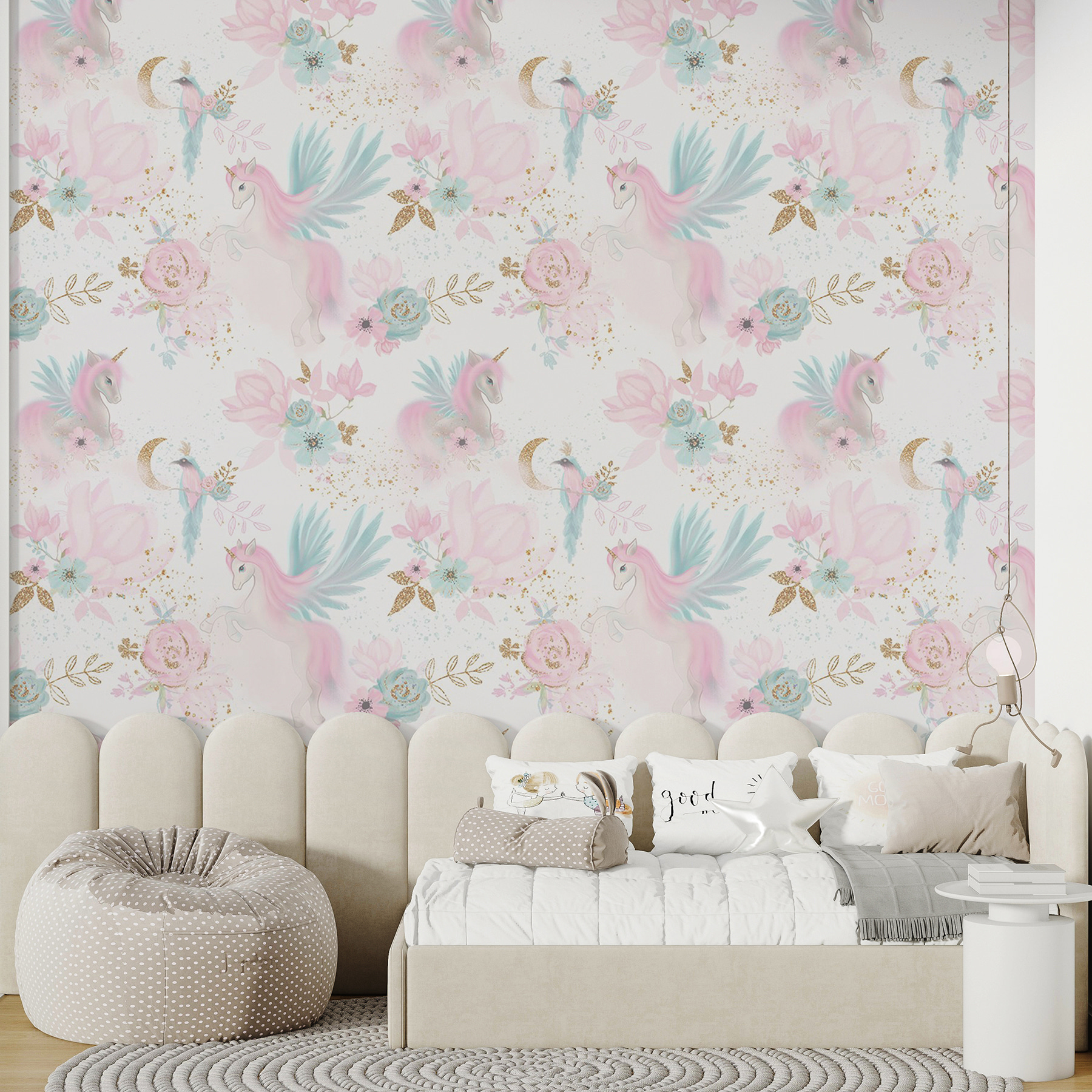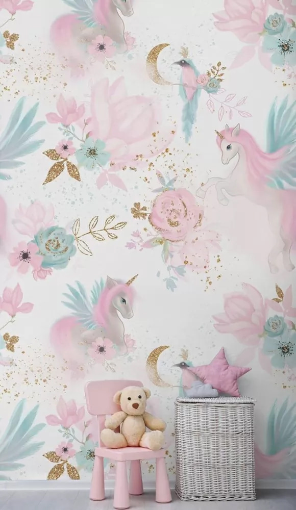 Mit diesem Wandbild, das fröhliche Einhörner inmitten pastellfarbener Blüten zeigt, lässt sich ein Raum ganz einfach in ein skurriles Wunderland verwandeln. Stellen Sie sich vor: eine triste Wand erwacht plötzlich zum Leben und zaubert ein Lächeln auf die Lippen von Kindern und Erwachsenen gleichermaßen. Die sanften Farbtöne schaffen eine verträumte Atmosphäre, die zum Spielen oder Träumen einlädt. Stellen Sie sich vor, Sie lesen ein Buch in dieser magischen Umgebung, in der jeder Blick wie in ein Märchen wirkt. Mit ein wenig Fantasie entsteht ein warmer, einladender Raum, in dem hinter jeder Ecke Abenteuer warten.