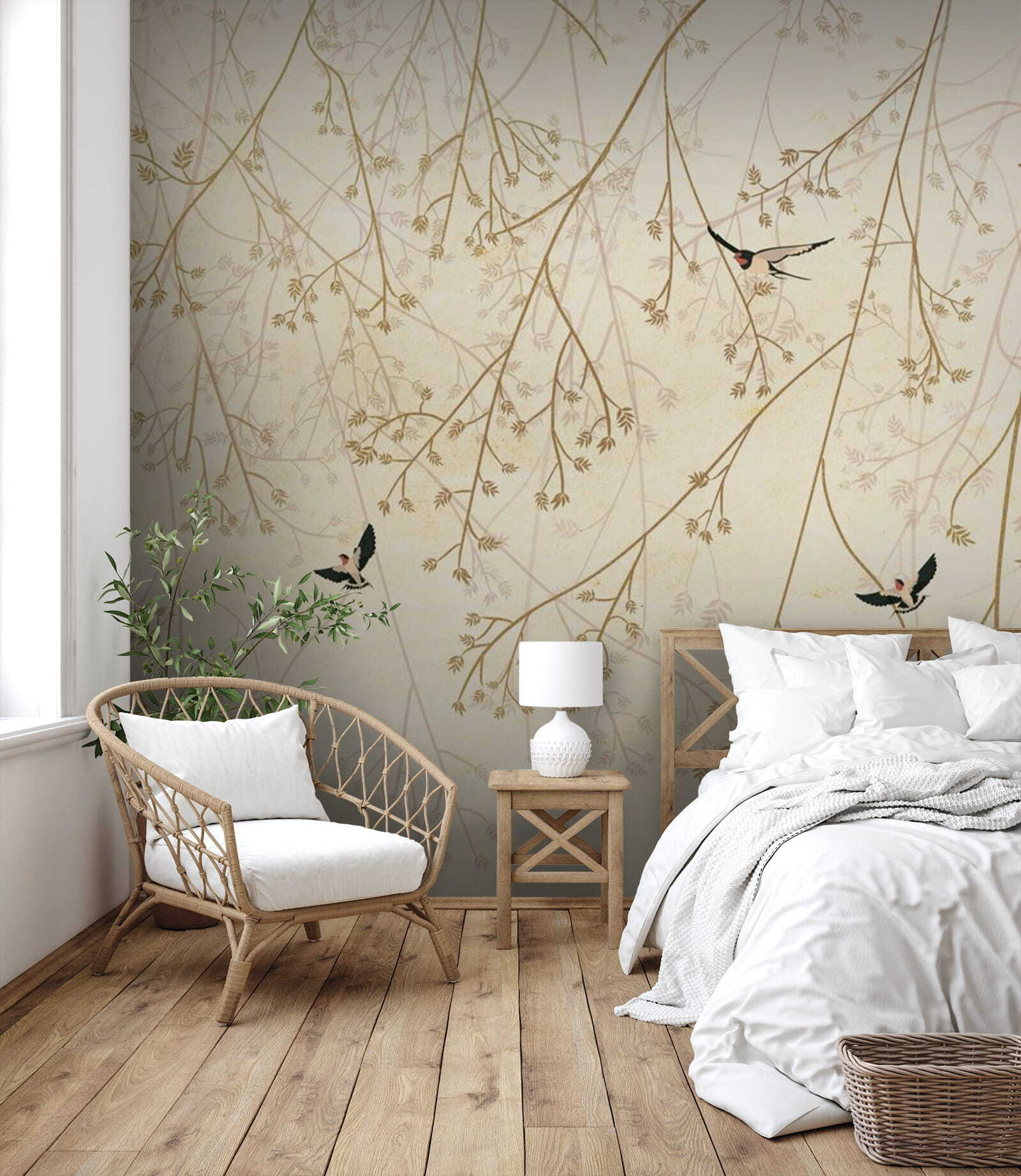 Stellen Sie sich einen gemütlichen Sonntagmorgen vor, an dem Sie Kaffee trinken und eine sanfte Brise spüren – dieses Wandbild mit Vögeln, die durch zarte Äste fliegen, bringt genau diese Stimmung in Ihren Raum. Es ist, als hätten Sie ein Stück der Ruhe der Natur direkt an Ihrer Wand. Die sanften, erdigen Töne fügen sich mühelos in jede Einrichtung ein und verleihen Ihrem Raum eine gemütliche und einladende Atmosphäre.