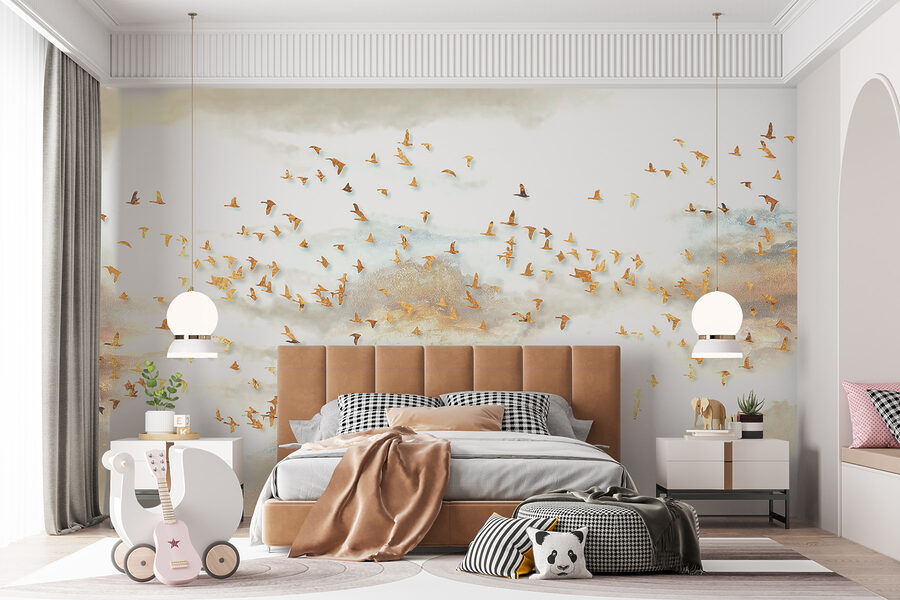 Verwandeln Sie jeden Raum in einen ruhigen Zufluchtsort mit dieser atemberaubenden Fototapete mit einer Gruppe von Vögeln, die durch einen verträumten Himmel fliegen. Die sanften Farben und die anmutigen Vögel schaffen eine Atmosphäre, die sich ruhig und erhebend anfühlt, wie eine frische Brise an einem Frühlingstag. Stellen Sie sich vor, Sie nippen an Ihrem Morgenkaffee oder entspannen sich nach einem langen Tag, während Sie diese fesselnde Szene betrachten. Es zieht Sie in seinen Bann und regt zu Tagträumen und Geschichten an. Außerdem verleiht es jedem Raum einen schicken Touch, egal ob es sich um ein gemütliches Wohnzimmer oder ein ruhiges Schlafzimmer handelt. Wer würde nicht gerne das Gefühl haben, durch die Wolken zu schweben?