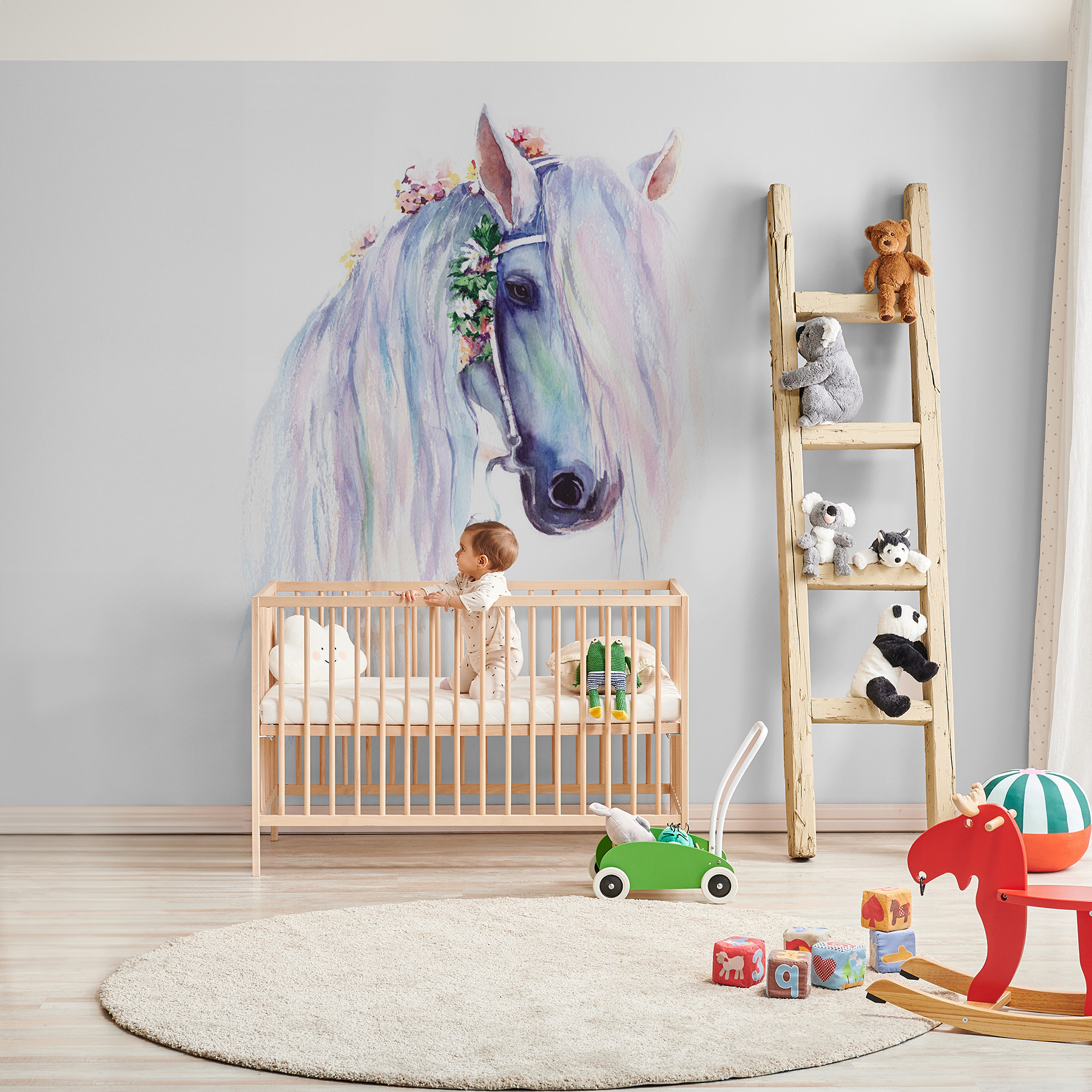 Verschönern Sie jeden Raum mit dieser reizvollen Fototapete, die ein majestätisches, blumengeschmücktes Pferd zeigt. Stellen Sie sich vor, Sie betreten einen Raum und werden von diesem sanften Riesen begrüßt, dessen elegante Mähne wie ein bunter Wasserfall herabfällt. Perfekt für Kinder und Liebhaber skurriler Dekorationen gleichermaßen, bringt es einen Hauch von Natur ins Haus. Die sanften Pastelltöne lassen alles leichter erscheinen und zaubern ein Lächeln ins Gesicht. Stellen Sie sich vor, Sie lesen mit Ihren Kleinen eine Geschichte, während Sie sich an dieses Wandbild schmiegen – jeder Blick ist ein kleines Abenteuer, das auf Sie wartet. Es ist nicht nur eine Dekoration, es ist eine Einladung zum Träumen!