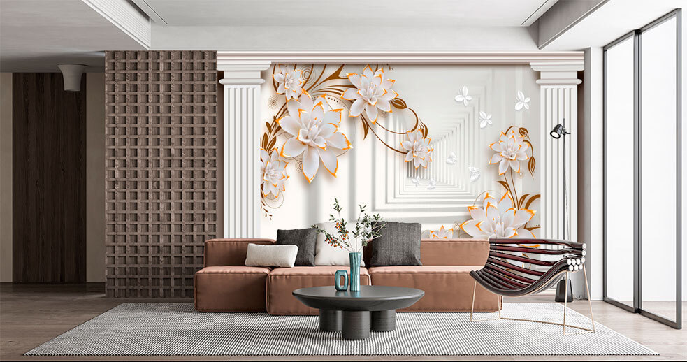 Verwandeln Sie Ihren Raum in ein blühendes Paradies mit den Wandbildern Floral Elegance mit architektonischen Säulen. Stellen Sie sich vor: Sie betreten einen Raum und werden von übergroßen Blüten begrüßt, die über die Wände zu tanzen scheinen und Sie mit ihrem zarten Charme anziehen. Der sanft gedämpfte Hintergrund lässt die Blumen hervorstechen und macht sie zu den Stars der Show – als würden sie auf einer Gartenparty um die Aufmerksamkeit buhlen.