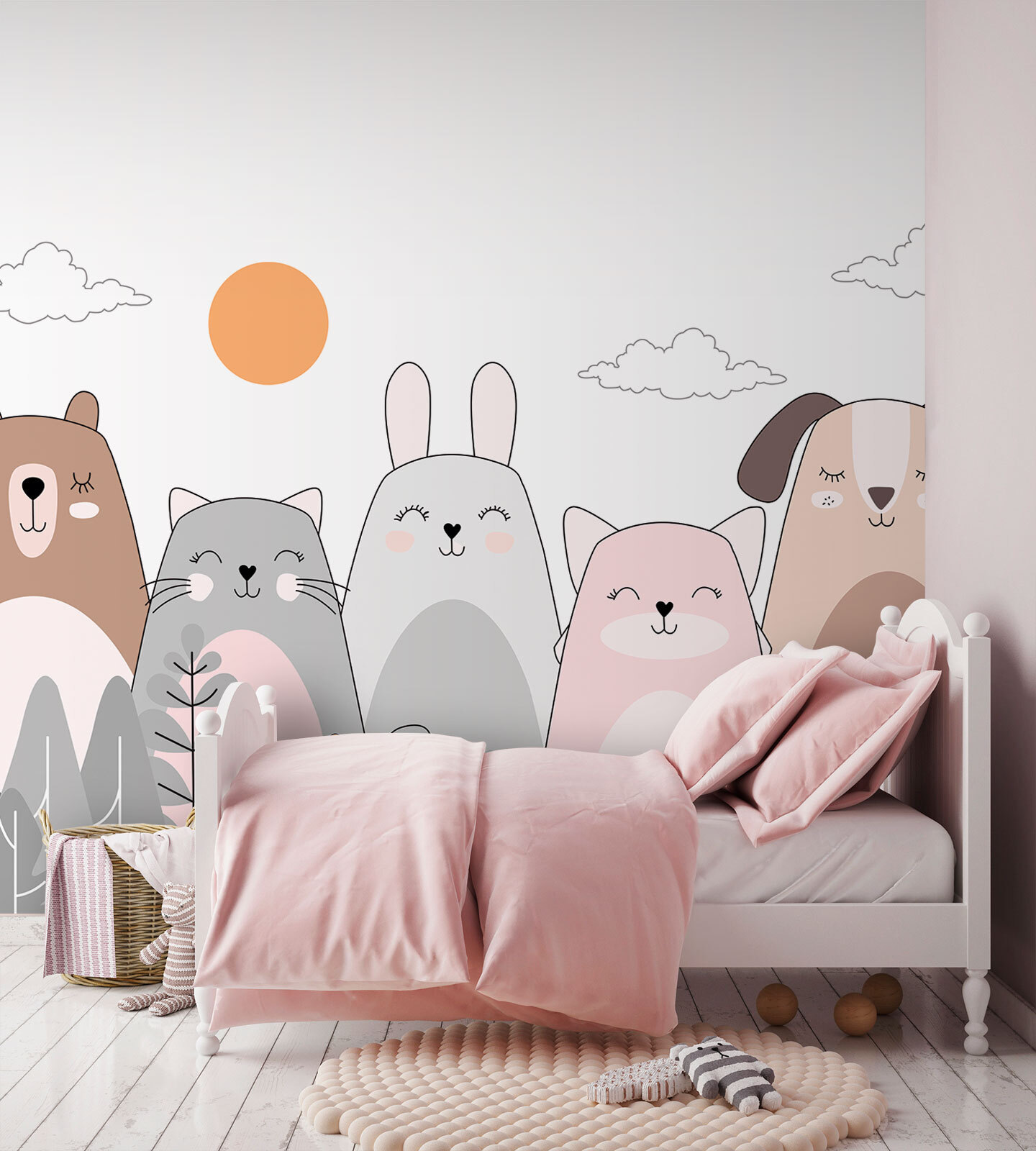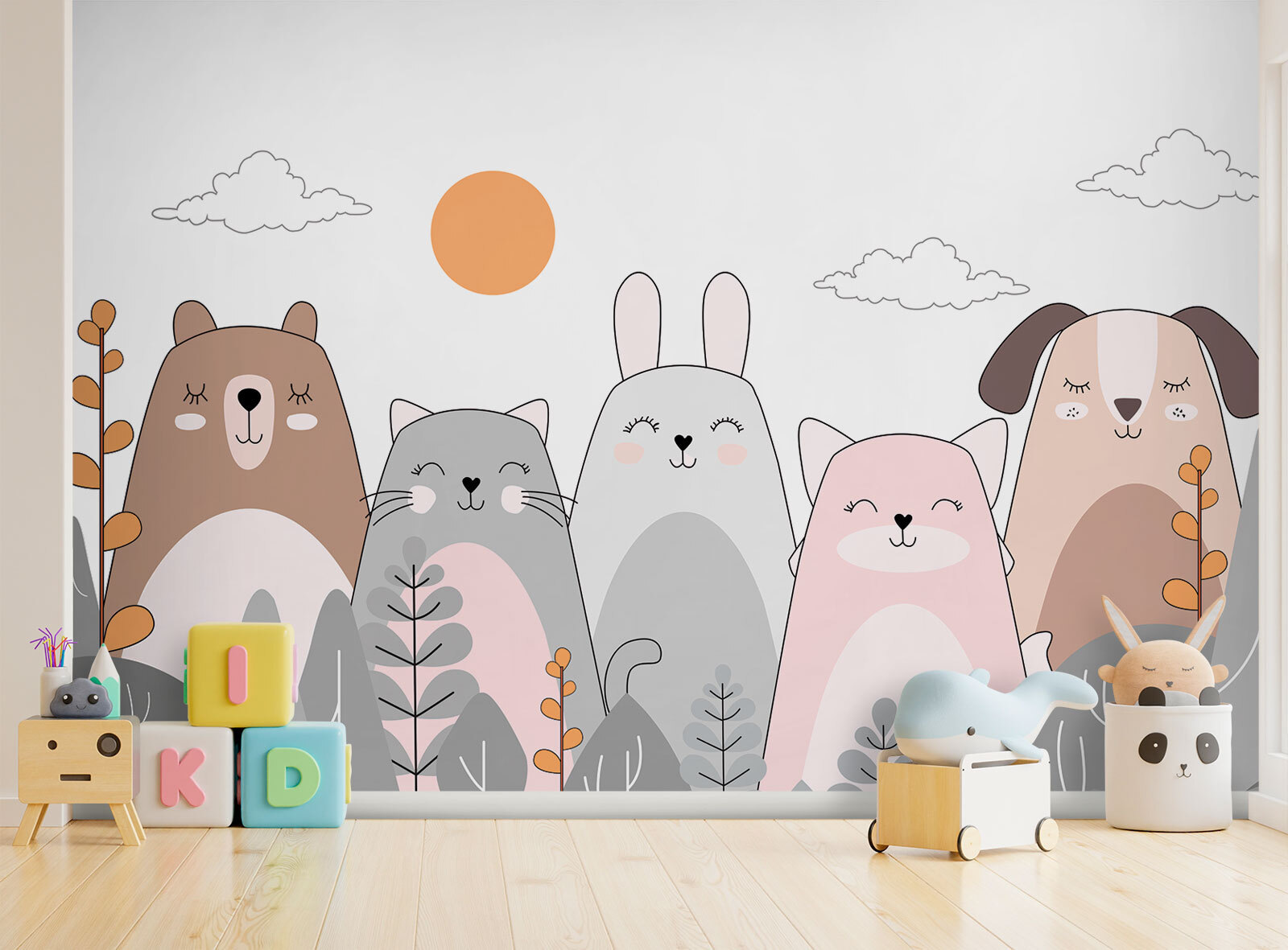 Verschönern Sie Ihr Kinderzimmer mit dieser entzückenden Fototapete “Happy Animals Enjoying the Sun”. Stellen Sie sich einen sonnenbeschienenen Wald vor, in dem liebenswerte Tiere einfach nur chillen und das Leben genießen – es ist wie ein Blick in eine skurrile Welt, in der alles warm und kuschelig ist. Die sanften Aquarelltöne dieses Wandgemäldes sind perfekt für Söhne, Töchter oder sogar für einen Hauch von Freude in jedem Raum und vermitteln eine verspielte und doch heitere Atmosphäre. Die Kinder werden es lieben, jeden Morgen von diesen freundlichen Gesichtern geweckt zu werden, die eine fröhliche Stimmung in den Tag bringen. Mal ehrlich, wer kann diesem bezaubernden Lächeln schon widerstehen? Dieser Druck ist mehr als nur Dekoration; er ist eine sonnige Umarmung für Ihre Wände. Perfekt, um die Fantasie anzuregen und jeden Raum zu etwas ganz Besonderem zu machen.