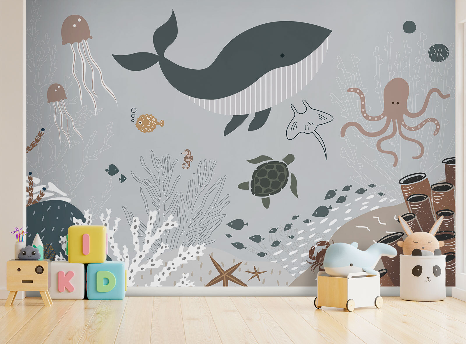 Stellen Sie sich vor, das Zimmer Ihres Kindes in eine bezaubernde Unterwasserwelt zu verwandeln – mit dieser verspielten “Cartoon of a Whale”-Wandmalerei. Das Wandbild ist perfekt für jedes Kinderzimmer und zeigt freundliche Meeresbewohner wie Wale, Schildkröten und Quallen in sanften Aquarelltönen. So holt man sich ein Stück Ozean ins Haus, ohne nass zu werden!