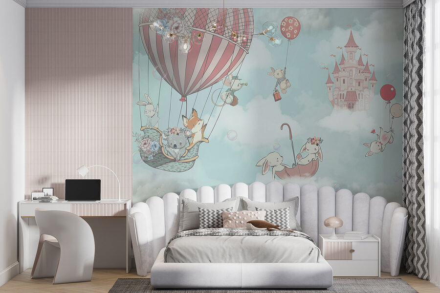 Die Kleinen werden es lieben, die bezaubernden Details zu entdecken – ein Koala mit einer Blumenkrone, winzige Häschen mit Luftballons, die alle zwischen flauschigen Wolken und einem verträumten Schloss im Hintergrund schweben. Die ganze Szenerie wirkt geradezu zauberhaft, so als könnten sie sich gleich nach dem Aufwachen in ihr eigenes Märchen stürzen.