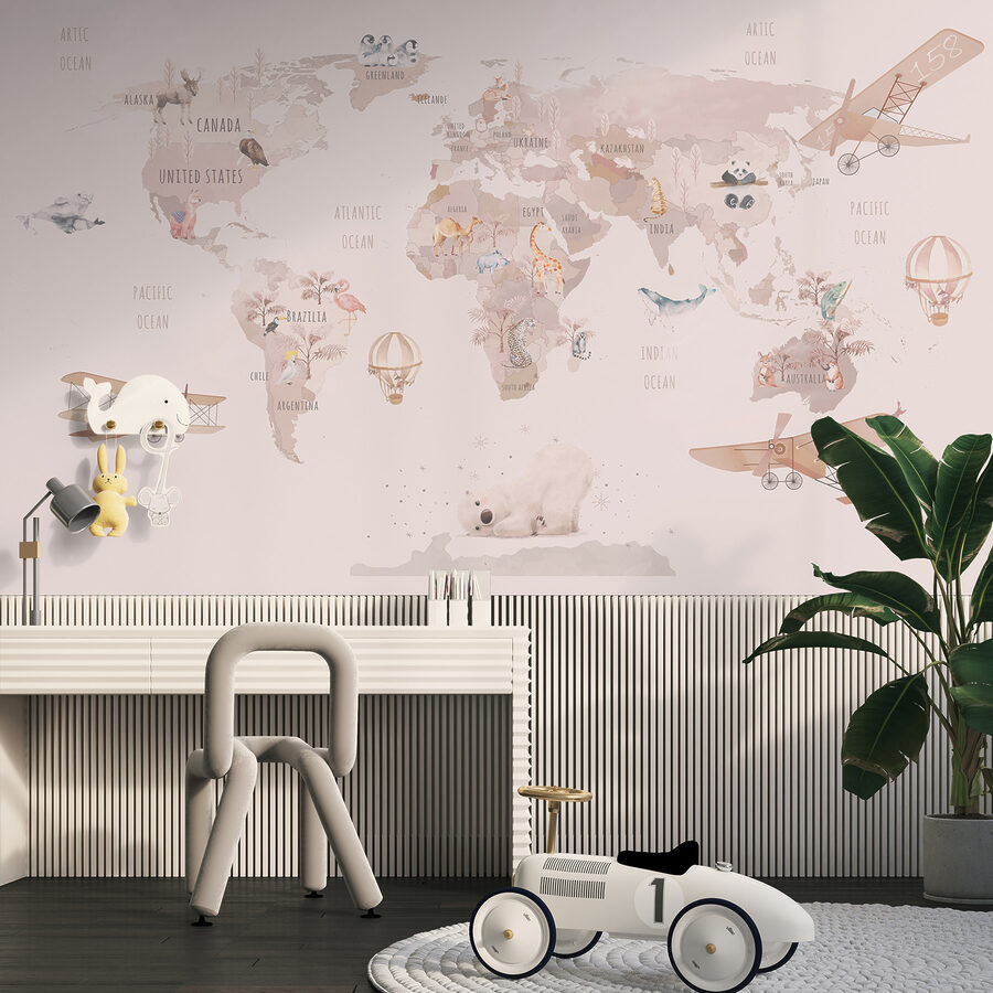 Verwandeln Sie jeden Raum in eine skurrile Reise rund um den Globus mit dieser entzückenden Fototapete “Map of the World”. Es ist wie ein Liebesbrief an das Abenteuer, mit bezaubernden Illustrationen von Tieren und verspielten Flugzeugen, die sofort Neugierde und Fernweh wecken. Stellen Sie sich vor, wie die Kleinen auf ihre Lieblingsländer zeigen oder von exotischen Ländern träumen, während sie von diesen charmanten Motiven umgeben sind. Mit sanften Farben und verspielten Elementen verwandelt es Wände in eine Leinwand der Fantasie – perfekt für Kinderzimmer oder Spielzimmer. Dieses Wandbild dekoriert nicht nur, es lädt zu Geschichten und Träumen ein. Also, lasst uns auf Entdeckungsreise gehen!