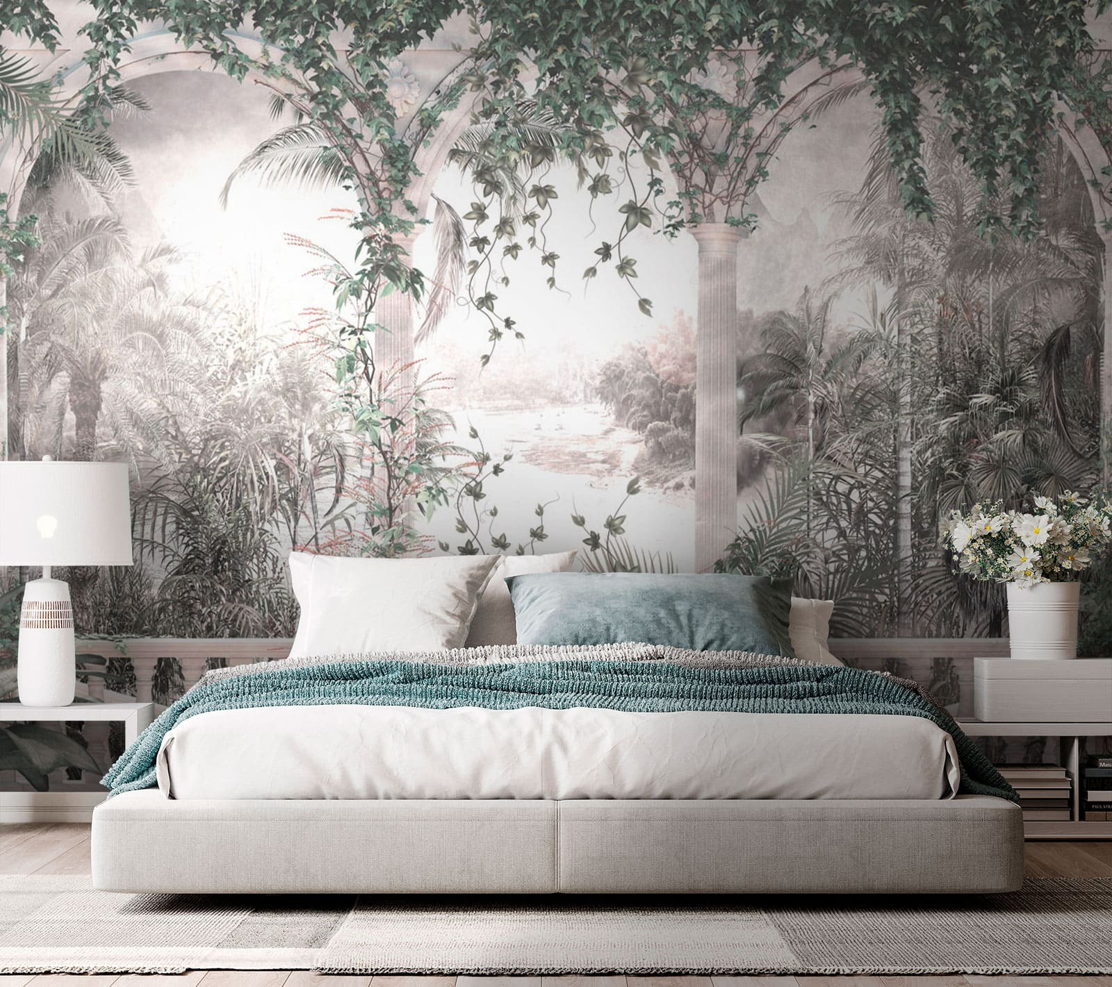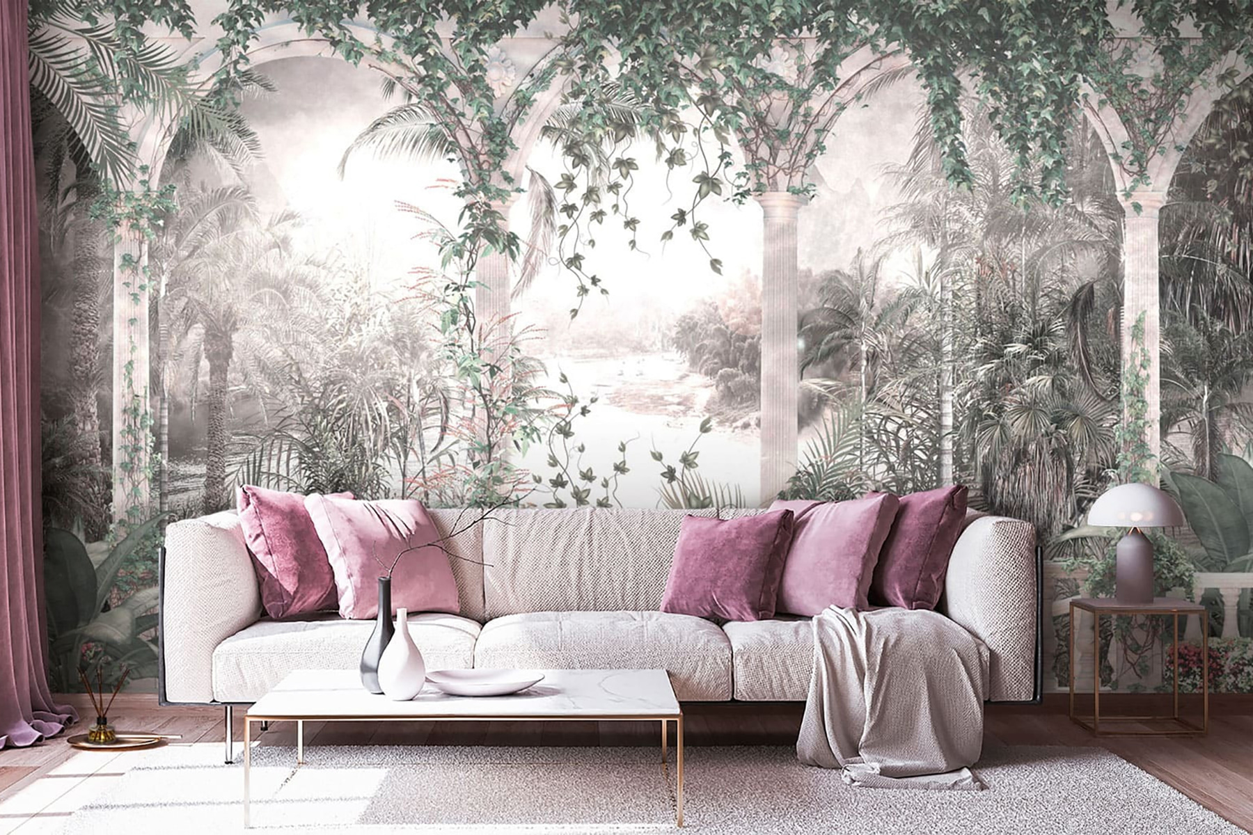 Mit dieser Fototapete, die üppige Weinreben und anmutige Bögen in Ihr Zuhause einlädt, treten Sie in eine heitere Welt ein. Stellen Sie sich vor, Sie schlürfen Ihren Morgenkaffee, während das Sonnenlicht durch das Grün der Blätter fällt und eine friedliche Atmosphäre schafft, die sowohl erfrischend als auch zeitlos ist. Der sanfte Hintergrund deutet eine ruhige Landschaft an, die es leicht macht, die Außenwelt zu vergessen. Diese Fototapete ist nicht nur eine Wanddekoration, sie ist ein kleiner Urlaub, der auf sich warten lässt. Es eignet sich perfekt, um einen tristen Raum in eine gemütliche Ecke zu verwandeln, und verleiht ihm eine Schicht von Wärme und Charme, die die Fantasie anregt.