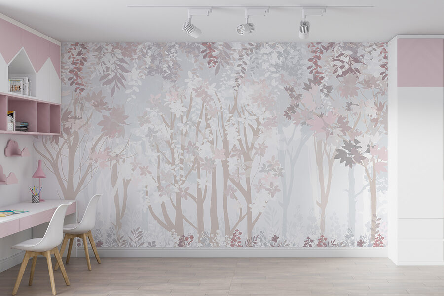 Fototapeten Pastellfarbener Wald mit zartem Laub Fototapeten Pastellfarbener Wald mit zartem Laub