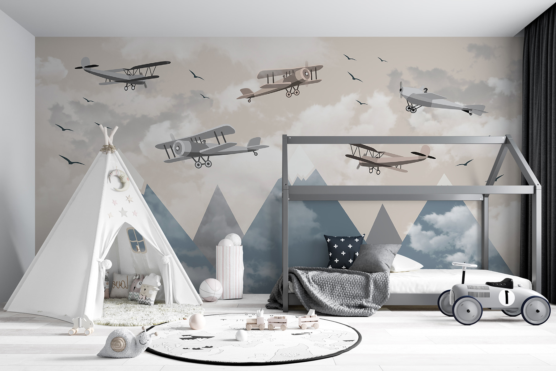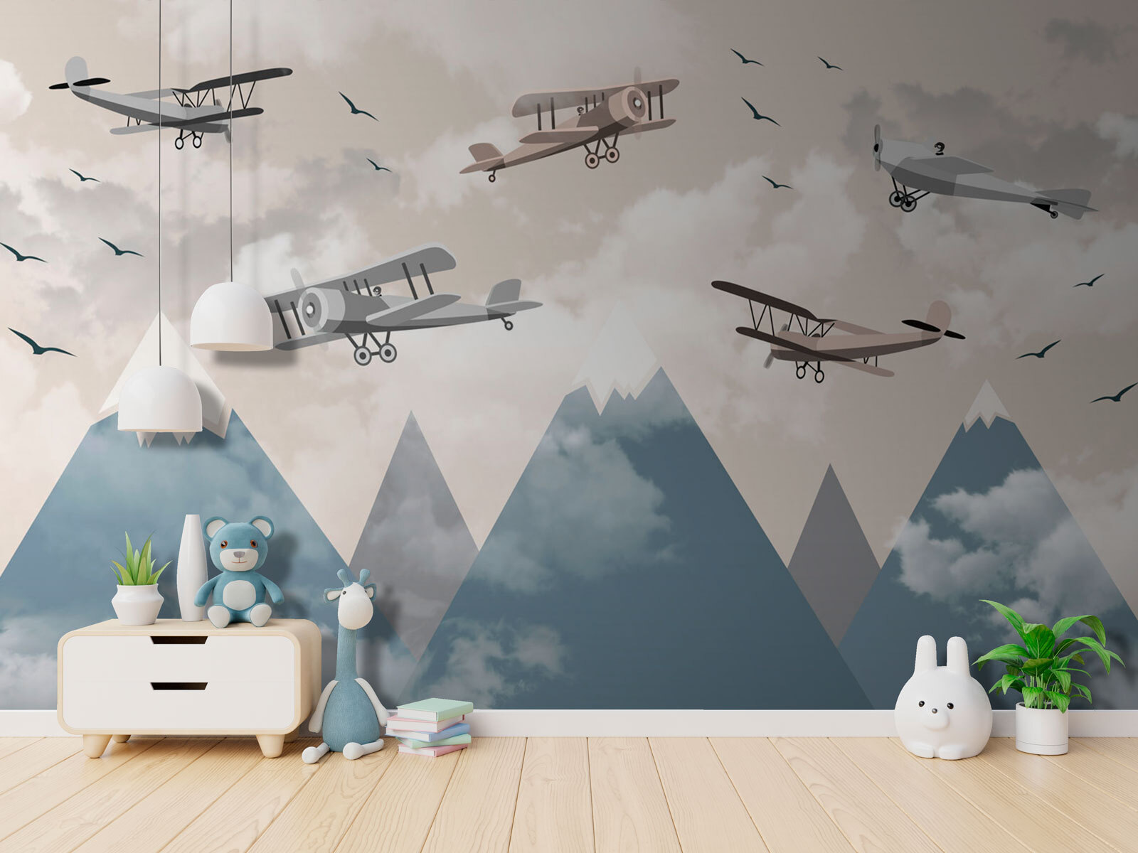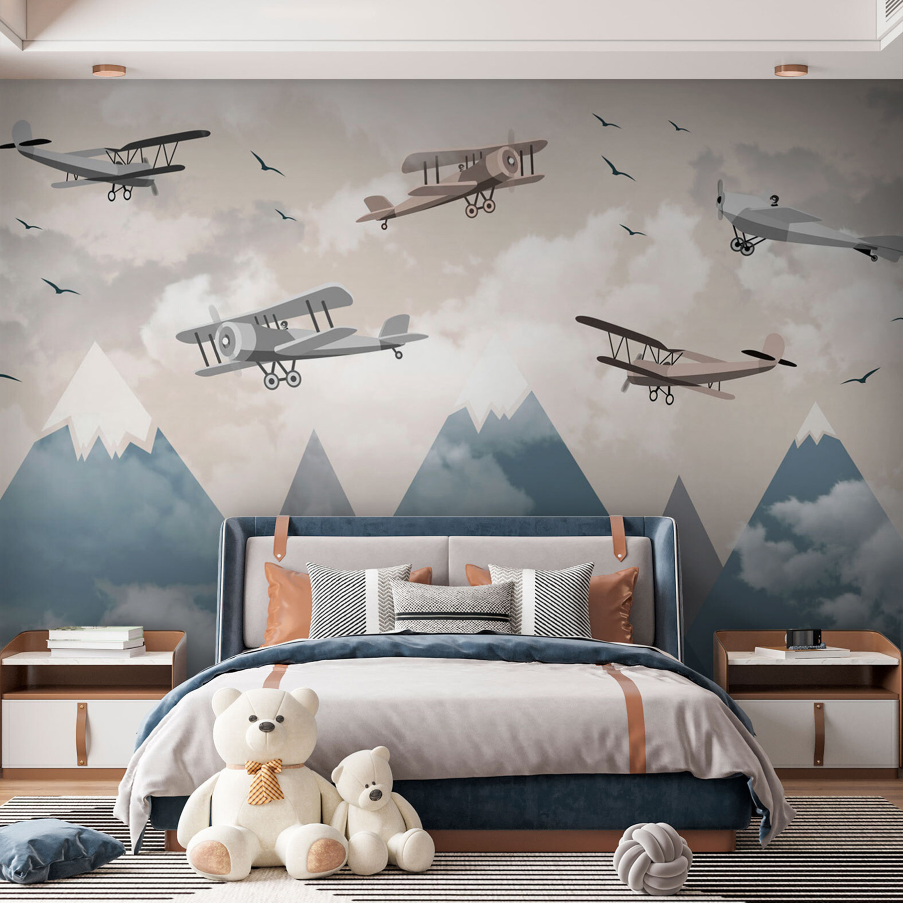 Stellen Sie sich vor, Sie betreten Ihren Raum und haben das Gefühl, dass Sie gerade in die Fantasie eines Fliegers eingetreten sind. “Fototapeten Biplanes Soaring Above Snowy Peaks” versetzt Sie an einen Ort, an dem der Himmel die Grenze ist – im wahrsten Sinne des Wortes. Diese charmanten Doppeldecker im Vintage-Stil, die mühelos über majestätischen, schneebedeckten Bergen schweben, verleihen jedem Raum einen skurrilen Touch. Sie eignen sich perfekt für ein Kinderzimmer oder eine gemütliche Leseecke und regen die Fantasie und vielleicht sogar ein paar abenteuerliche Tagträume an. Haben Sie einen zukünftigen Piloten zu Hause oder lieben Sie einfach einzigartige Dekoration? Dann ist diese Fototapete genau das Richtige für Sie. Lehnen Sie sich zurück, entspannen Sie sich, und lassen Sie Ihre Wände eine Geschichte erzählen.