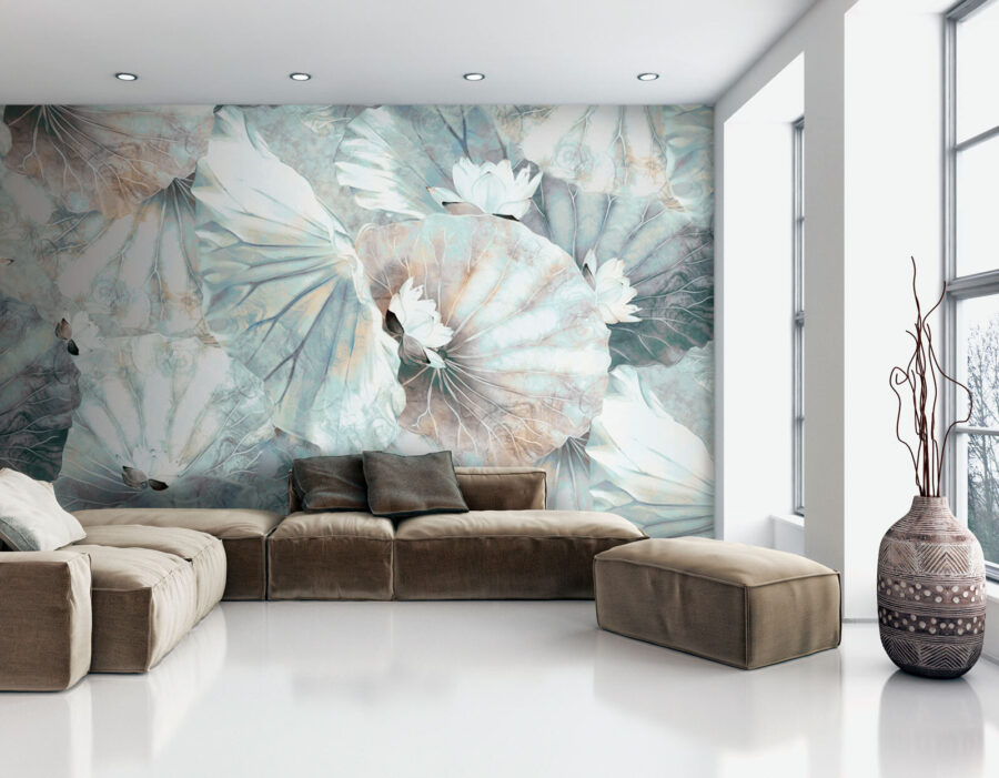 Verwandeln Sie Ihren Raum mit dieser eleganten Fototapete mit Lotusblüten und Blättern in eine heitere Oase. Stellen Sie sich vor, dass Sie jedes Mal, wenn Sie den Raum betreten, eine beruhigende Oase betreten. Die sanften, gedämpften Farben schaffen eine leichte und luftige Atmosphäre, die sich sowohl für gemütliche Ecken als auch für lebhafte Zusammenkünfte eignet. Es ist fast so, als ob das Flüstern der Natur Sie einlädt, sich zu entspannen, zu atmen und ein wenig zu träumen. Stellen Sie sich vor, Sie könnten diese Fototapete in Ihrem Büro anbringen, um sich inspirieren zu lassen, oder in einer Leseecke, um Ihre Märchenstunde zu verschönern. Dieses Design dekoriert nicht nur, es verwandelt Wände in eine Leinwand der Ruhe und erinnert Sie daran, dass Schönheit in jedem kleinen Detail zu finden ist. Wer hätte gedacht, dass eine Wand so viel Charme haben kann?