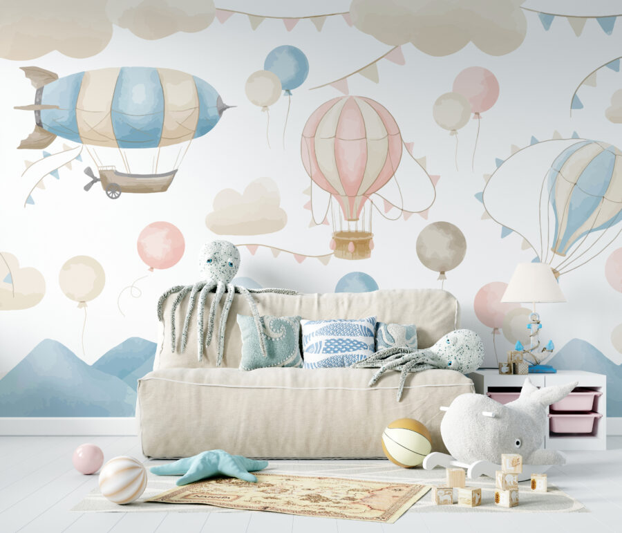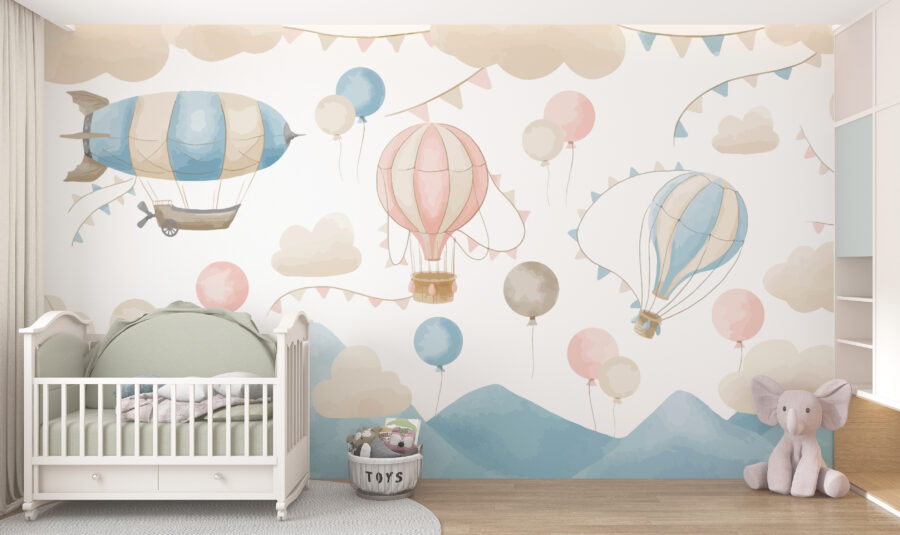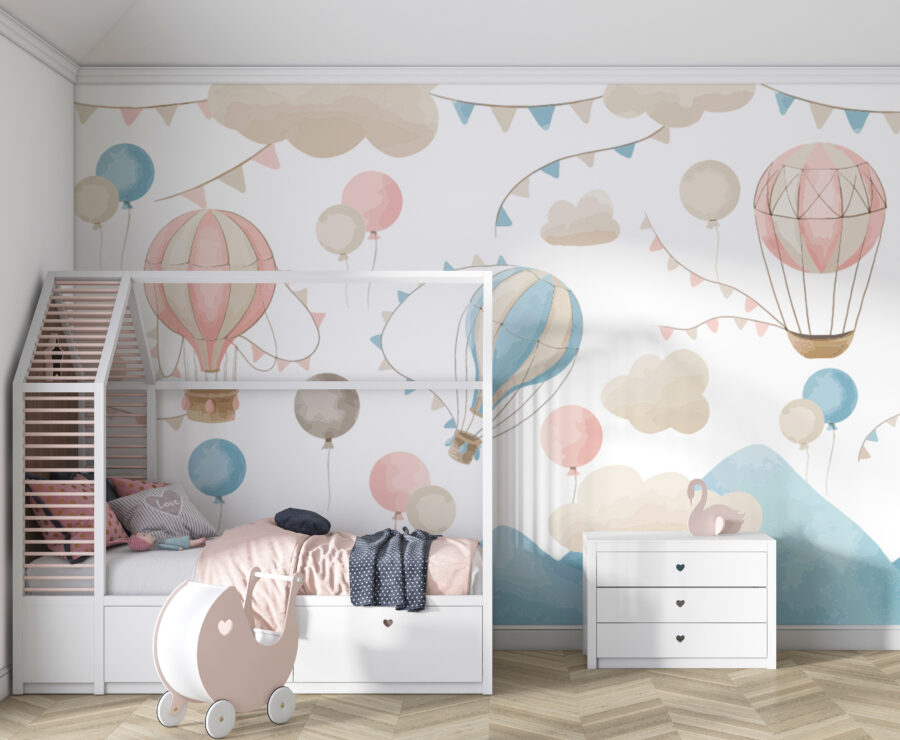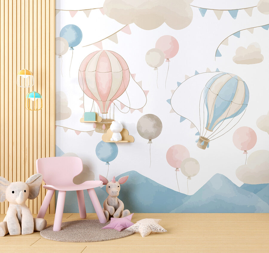 Stellen Sie sich diese bezaubernde Fototapete vor, auf der rosa und weiße Heißluftballons zwischen sanften Wolken und pastellfarbenen Wimpeln schweben. Jedes Mal, wenn Sie den Raum betreten, ist es, als würden Sie in eine verträumte, skurrile Welt eintauchen. Perfekt für den Raum Ihrer Kleinen – vor allem, wenn sie Abenteuer und Magie lieben. Dieses Wandbild passt perfekt in Kinderzimmer, Spielzimmer oder jeden Raum, der einen Hauch von Wunder braucht.