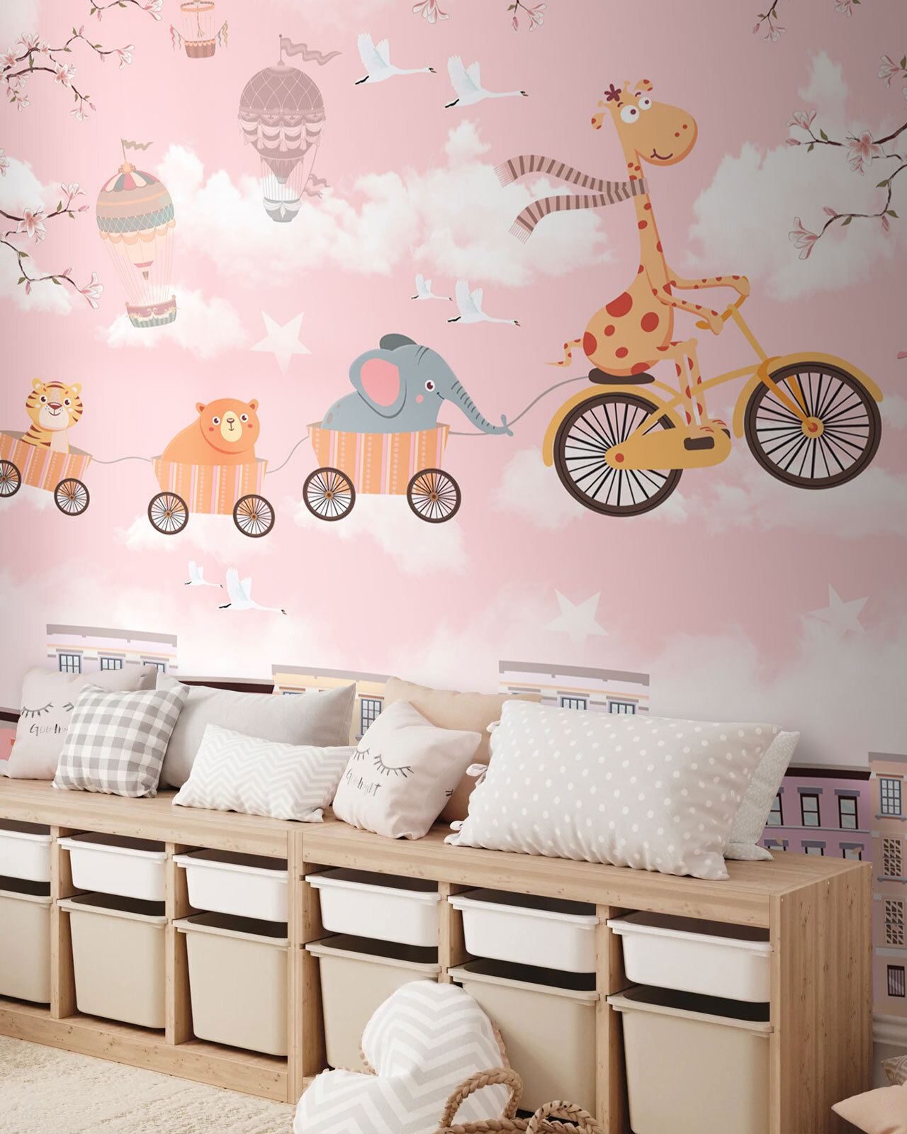 Stellen Sie sich vor, jeden Morgen mit einem Abenteuer aufzuwachen! Diese verspielte Fototapete “Fototapeten Animals Cycling Through the Sky Happily” aus der Kollektion Children’s Fototapeten bringt pure Freude in jedes Zimmer. Stellen Sie sich eine Giraffe und ihre entzückenden tierischen Freunde vor, wie sie durch flauschige Wolken inmitten von pastellfarbenen Häusern und Heißluftballons schweben – es ist wie eine eigene skurrile Parade. Perfekt für das Zimmer Ihrer Kleinen, weckt es Freude und regt die Fantasie an. Kinder werden kichern, wenn sie davon träumen, sich dem Spaß anzuschließen, und sich fühlen, als hätten sie ihre eigene geheime Himmelsreise. Dieses charmante und aufmunternde Wandbild verwandelt leere Wände in eine verträumte Märchenszene.