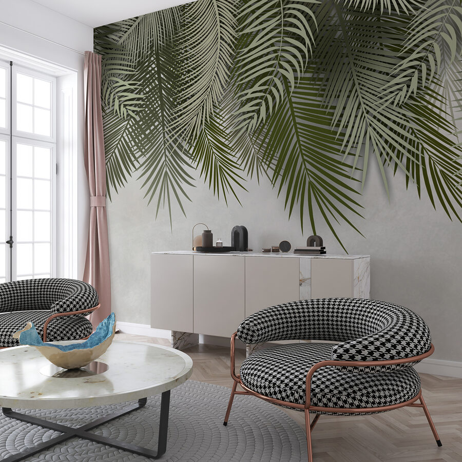 Das Wandbild wirkt lebendig, aber nicht erdrückend. Es reicht gerade aus, um an warme, luftige Tage zu denken, ohne dass man sich um das Gießen der Pflanzen kümmern muss. Es passt gut zu minimalistischen Designs oder Sie können es mit einer lebendigen, tropischen Dekoration aufpeppen – super vielseitig! Dieses Design atmet Leben und Frische und gibt Ihnen das Gefühl, unter einem Baldachin zu liegen und in den Himmel zu blicken. Wie cool ist das denn?