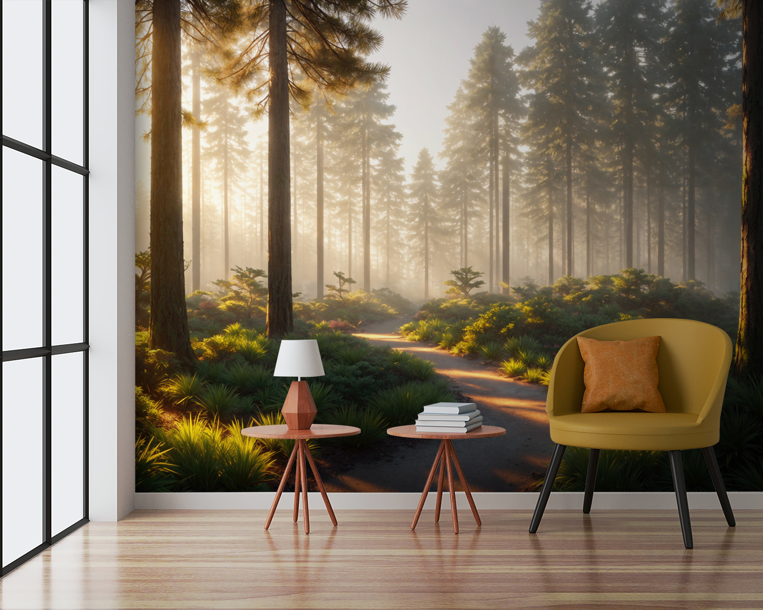 Verwandeln Sie Ihren Raum in einen ruhigen Zufluchtsort mit den Wandbildern Sunlit Forest Path Through Trees. Stellen Sie sich vor, dass Sie direkt von Ihrem Wohnzimmer aus einen ruhigen Wald betreten. Das sanfte Morgenlicht, das durch die hohen Bäume fällt, schafft eine friedliche Atmosphäre. Es ist wie eine sanfte Erinnerung an ruhige Wanderungen und flüsternde Brisen, perfekt für Tagträume oder einen Moment des Innehaltens in der Hektik des Lebens. Diese Fototapete bringt Wärme und einen Hauch von frischer Luft und lädt die Natur direkt ins Haus ein. Und vielleicht inspiriert es Sie dazu, die Wanderschuhe zu schnappen und sich auf den Weg zu machen – halten Sie Ausschau nach Eichhörnchen!