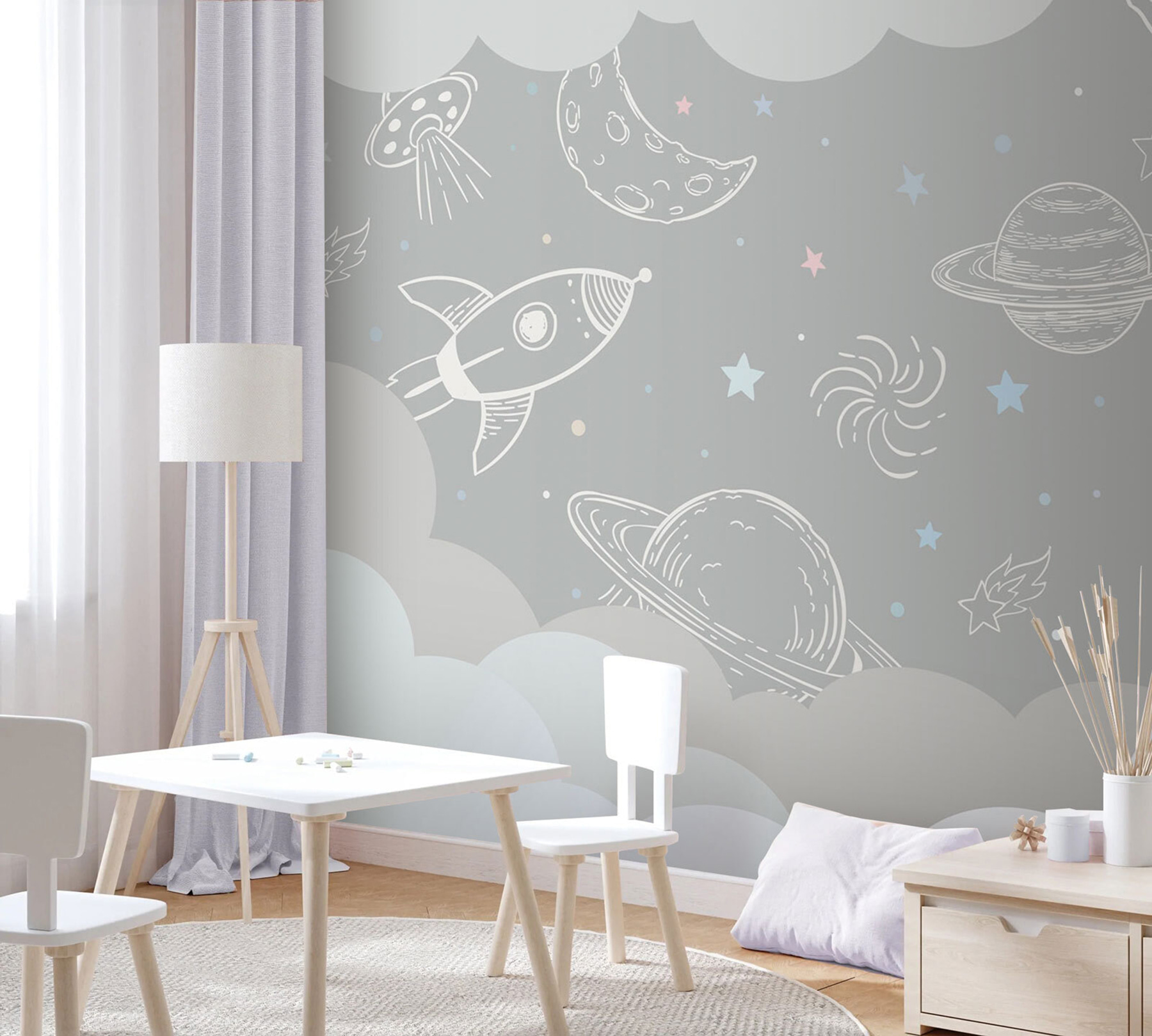 Sehen Sie sich diese bezaubernde Fototapete “Weißer Stern auf grauem Hintergrund” an! Es ist wie eine verträumte Reise durch den Weltraum direkt in Ihrem Zimmer. Perfekt für Kinder, vor allem für diejenigen, die nicht aufhören können, von Raketen und Astronauten zu reden. Stellen Sie sich vor, wie sich die Kleinen abends ins Bett legen und das Gefühl haben, unter den Sternen zu sein. Es hat diese handgezeichnete Atmosphäre mit Raumschiffen, Planeten und Sternen – wie Kritzeleien aus einem kosmischen Tagebuch.