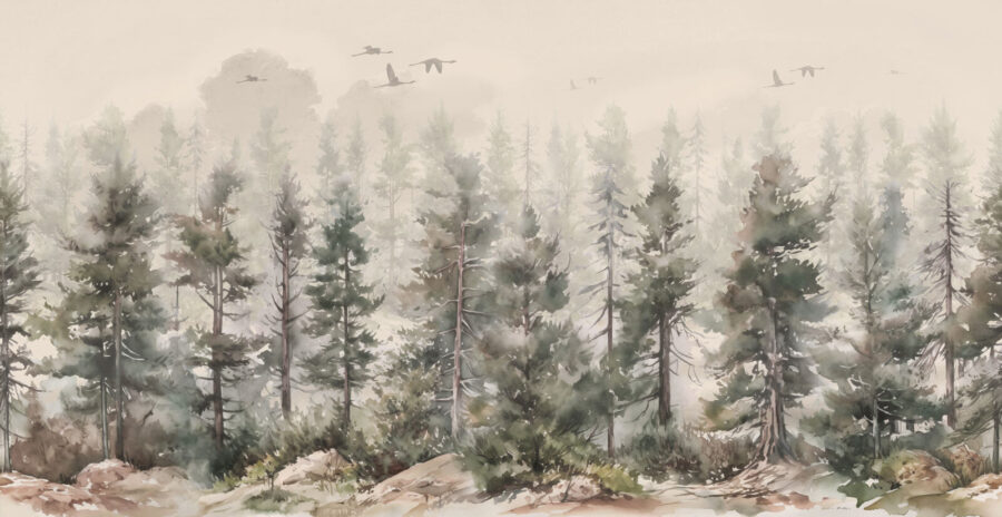 Stellen Sie sich vor, dass Sie jedes Mal, wenn Sie auf Ihre Wand blicken, in einen ruhigen Wald eintreten. Dieses Aquarell mit seinen verträumten Bäumen und sanften, gedämpften Farben bringt die Ruhe der Natur direkt in Ihr Zuhause. Es ist, als würde man sich ein Stück Ruhe an die Wand hängen und die Natur mit seiner Einrichtung verschmelzen lassen. Stellen Sie sich gemütliche Abende mit einem Buch vor, das magische Licht, das durch die Bäume fällt, und das ferne Zwitschern der Vögel – ach, wie schön! Diese Fototapete eignet sich perfekt für ein Wohnzimmer oder eine gemütliche Leseecke und lässt Ihren Raum lebendig, erfrischend und ein wenig verzaubert wirken.