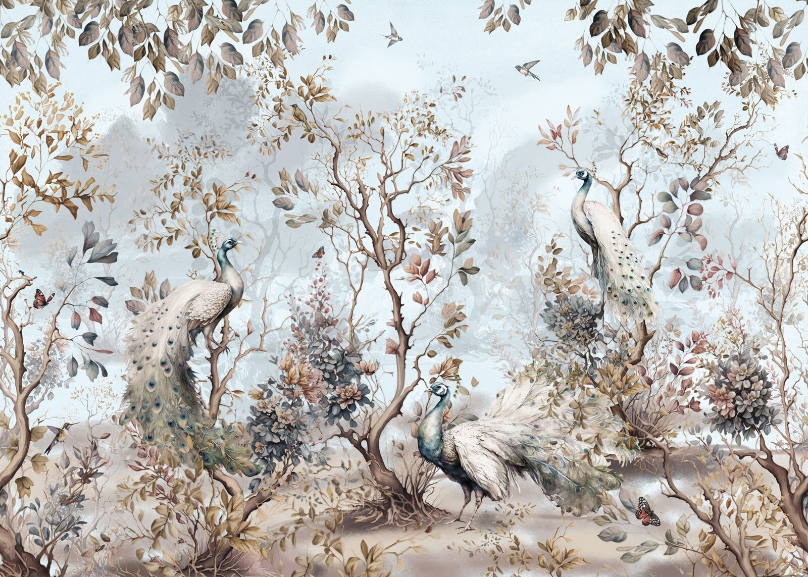 Möchten Sie einen Hauch von Natur in Ihr Haus bringen? Die Fototapete “Bird Flying in the Sky” könnte genau das sein, was Ihr Raum braucht. Stellen Sie sich vor, Sie wachen auf und sehen diese verträumte Szene mit eleganten Pfauen, die um wunderschön gemalte Bäume herum stolzieren. Die sanften Farbtöne und die filigranen Details sorgen dafür, dass Sie sich wie in einer ruhigen Umarmung der Natur fühlen – direkt in Ihrem Wohn- oder Schlafzimmer.