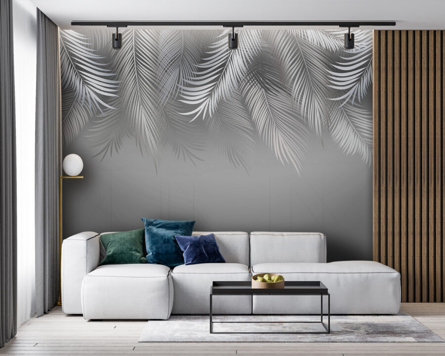 Fototapeten Silberne Palmenblätter auf grauem Hintergrund. (Artikelnummer: u94962)