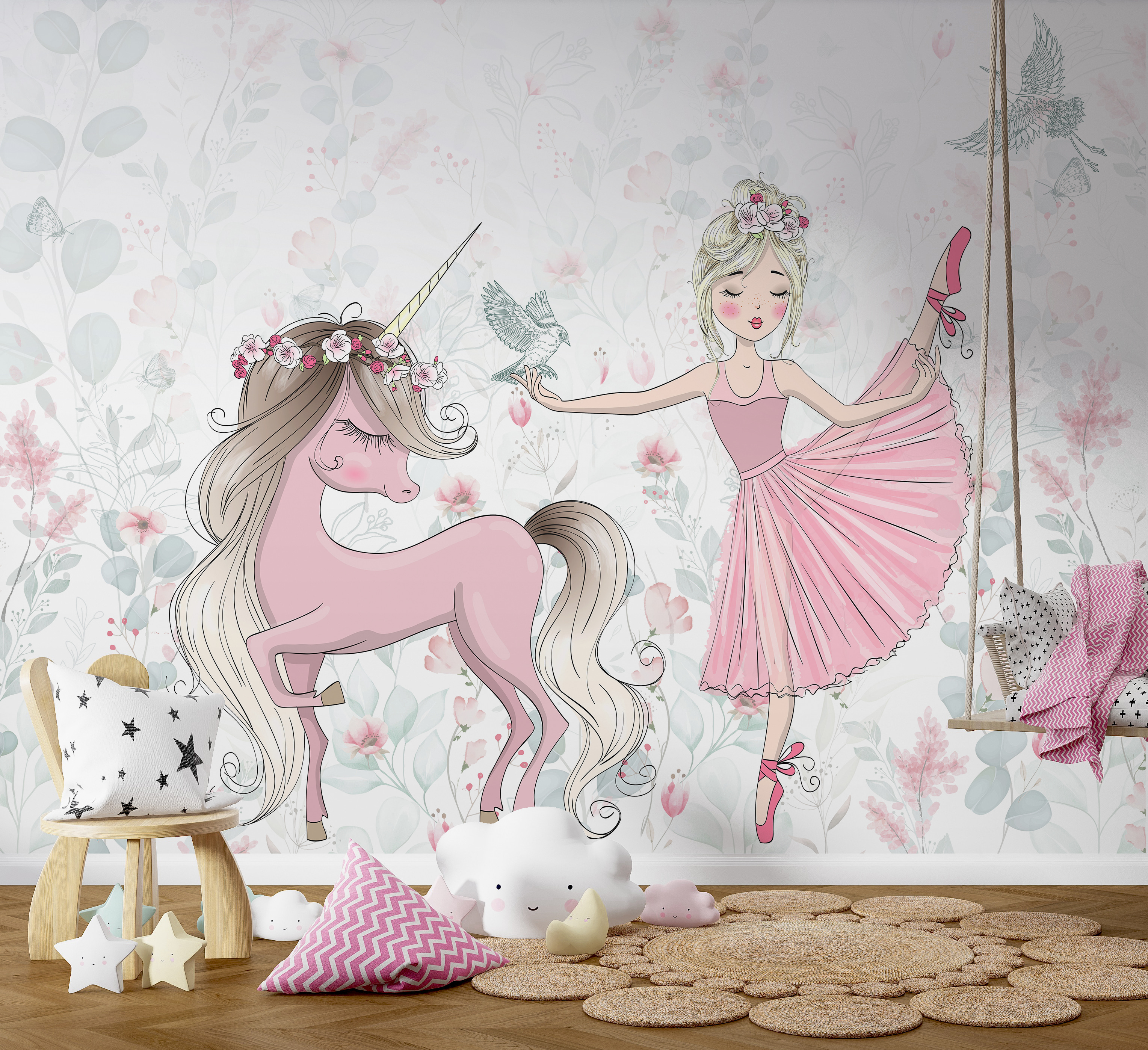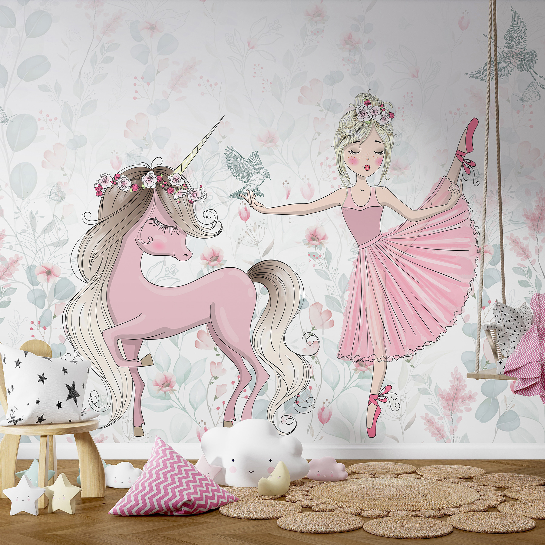 Haben Sie jemals davon geträumt, mit einem Einhorn zu tanzen? Dieses Wandbild “Ballerina und Einhorn” erweckt diese magische Fantasie zum Leben. Ideal für ein Kinderzimmer, vor allem für die kleinen Ballerina- und Einhorn-Fans da draußen! Stellen Sie sich vor, wie Ihre Tochter jeden Morgen mit diesem Bild aufwacht – eine wahre Freude. Die zarten pastellfarbenen Blumen und die filigranen Details machen es zu einer bezaubernden Kulisse – perfekt für die Märchenstunde oder die Spielzeit. Es ist, als würde man in ein Märchen eintauchen; die sanften Farben und skurrilen Designs schaffen einen beruhigenden und fantasievollen Raum. Es fühlt sich an wie ein Moment direkt aus einem Märchenbuch. Nicht nur ein Wandbild – es ist ein Hauch von Magie für jeden Raum. Ganz ehrlich, können Sie nicht fast das Kichern hören und die Wirbel sehen?
