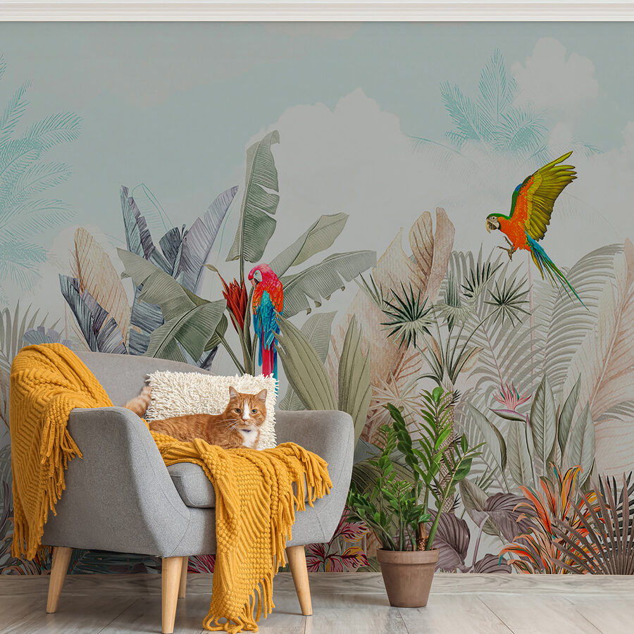 Lernen Sie Ihre neue Wandbesessenheit kennen: die Fototapete “Colorful Parrot Flying in the Air”. Es ist, als ob der Traum eines Vogelbeobachters direkt in Ihrem Wohnzimmer gelandet wäre! Stellen Sie sich zwei farbenfrohe Papageien vor, die über grünes Laub und tropische Blumen gleiten. Es ist wie ein Mini-Urlaub im Regenwald – nur ohne die Mücken, Gott sei Dank!