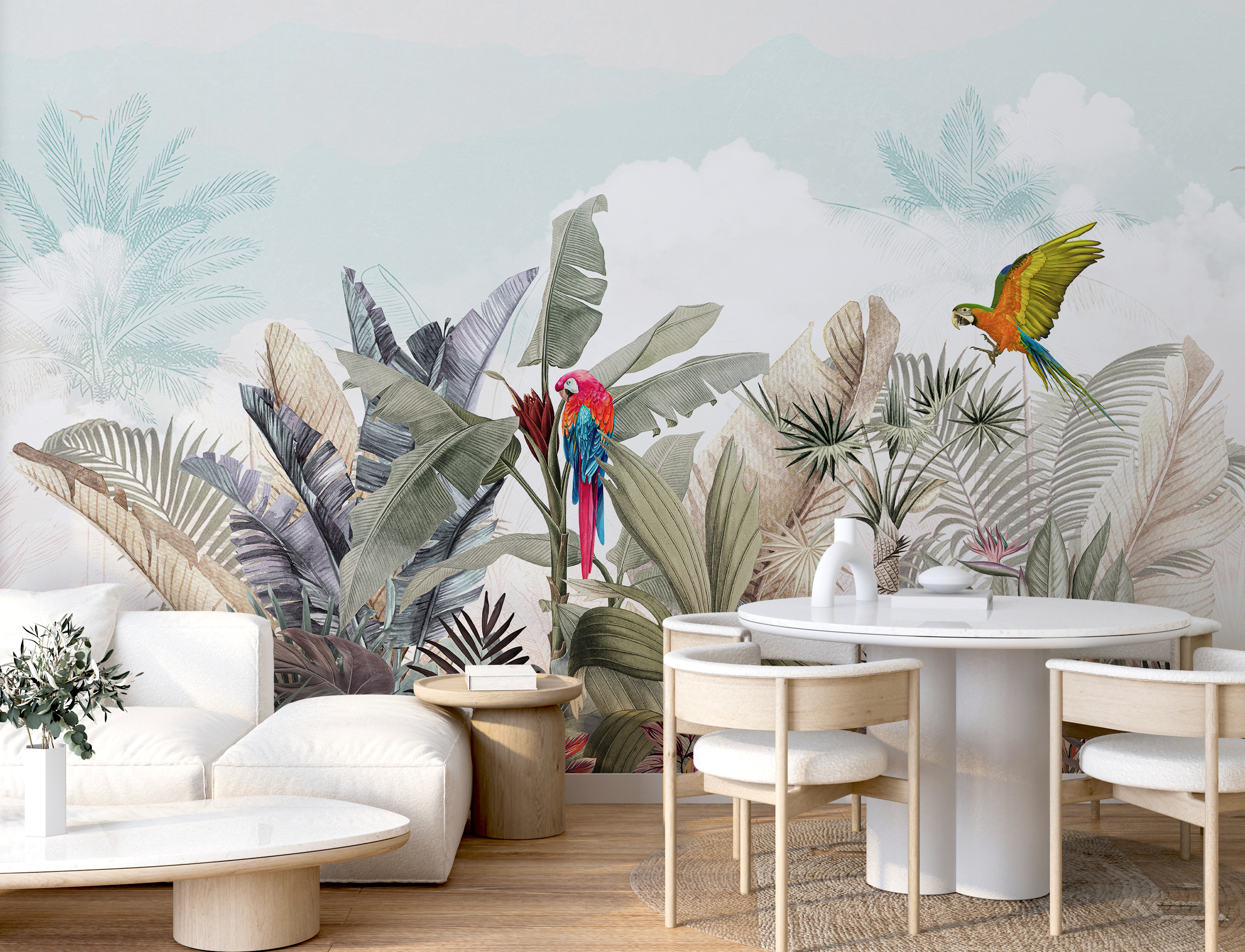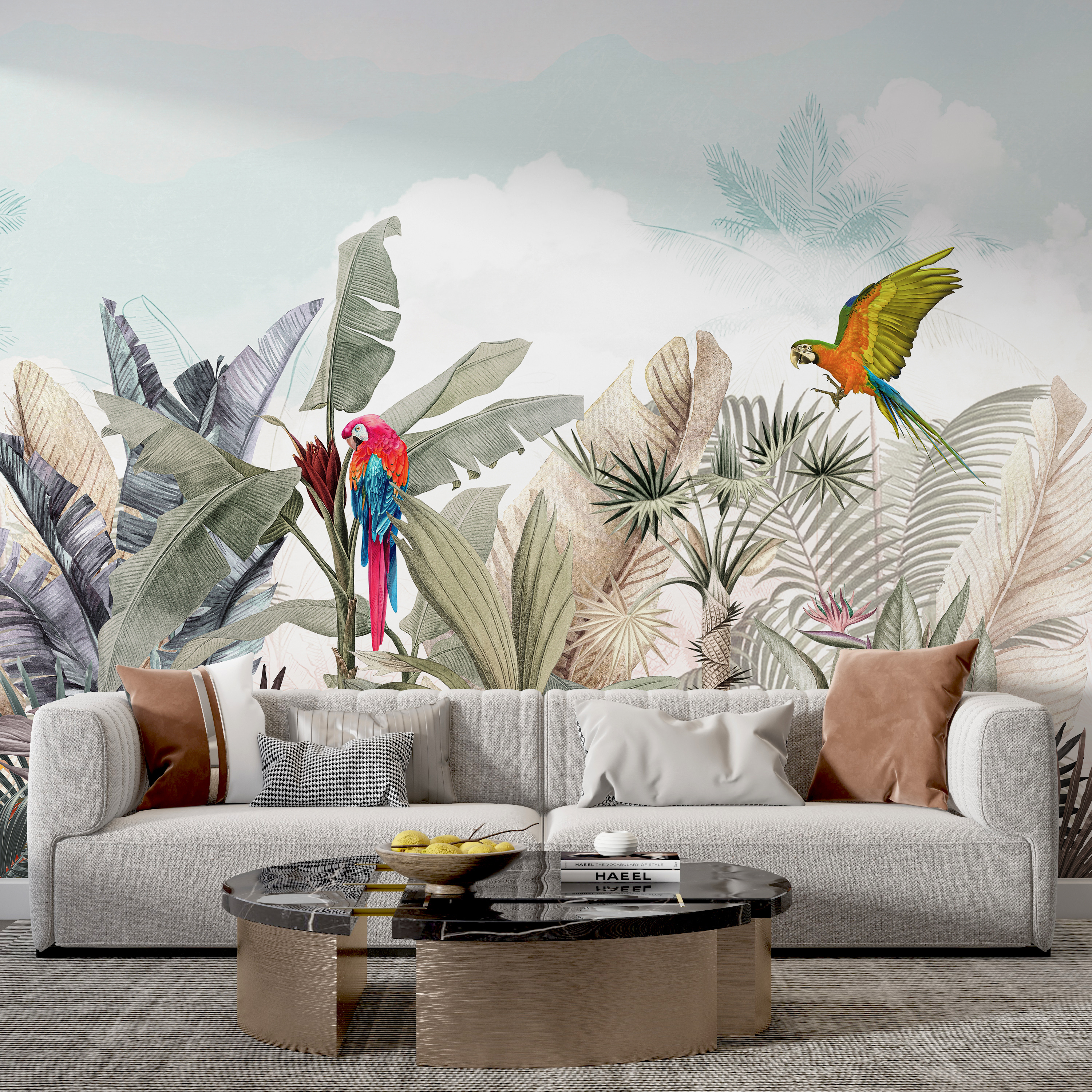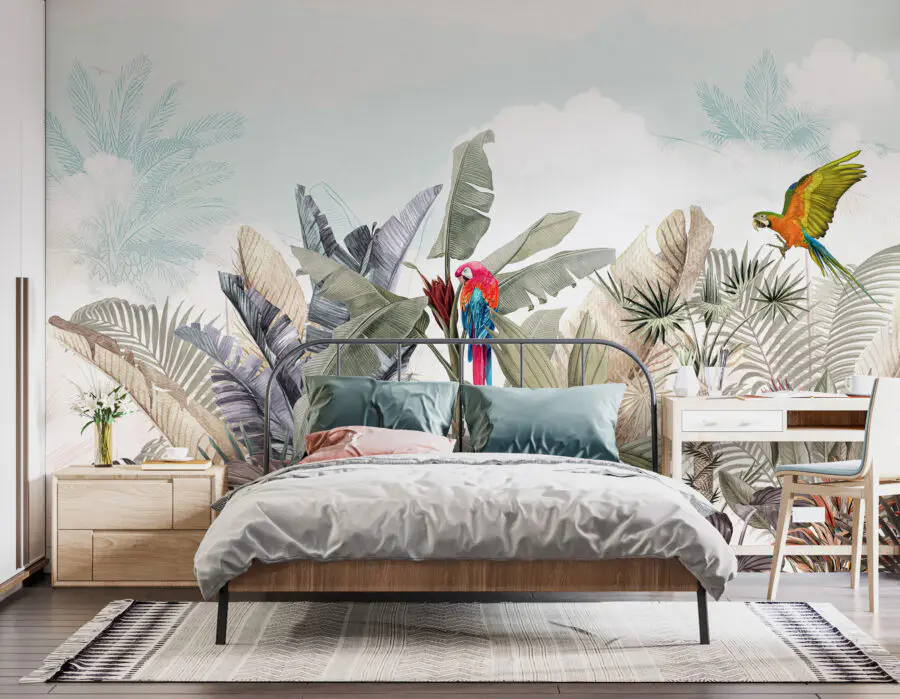 Lernen Sie Ihre neue Wandbesessenheit kennen: die Fototapete “Colorful Parrot Flying in the Air”. Es ist, als ob der Traum eines Vogelbeobachters direkt in Ihrem Wohnzimmer gelandet wäre! Stellen Sie sich zwei farbenfrohe Papageien vor, die über grünes Laub und tropische Blumen gleiten. Es ist wie ein Mini-Urlaub im Regenwald – nur ohne die Mücken, Gott sei Dank!
