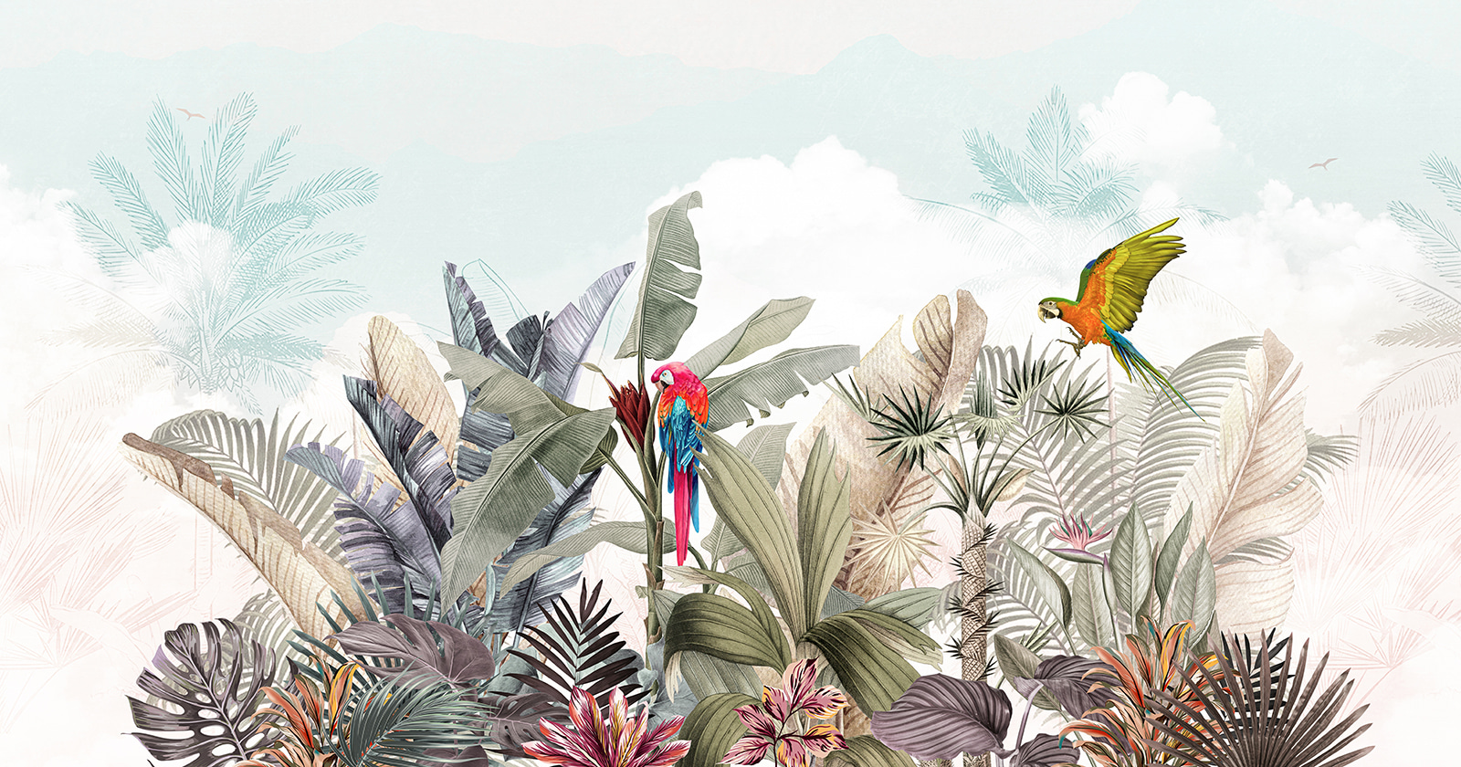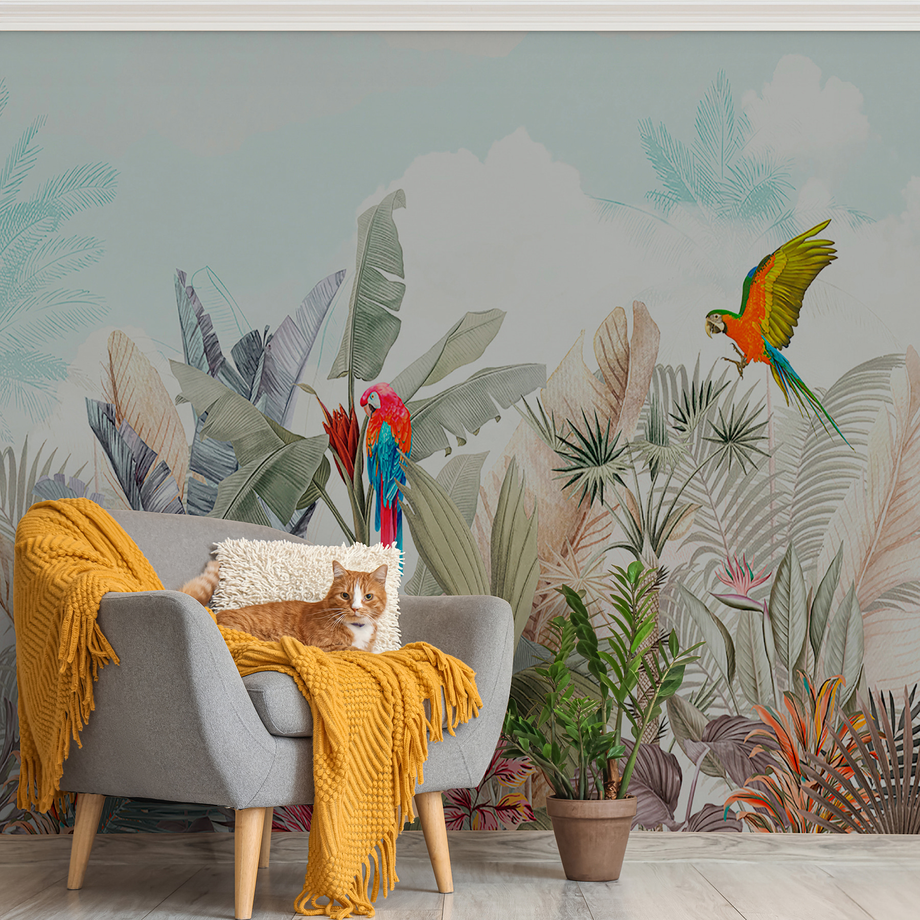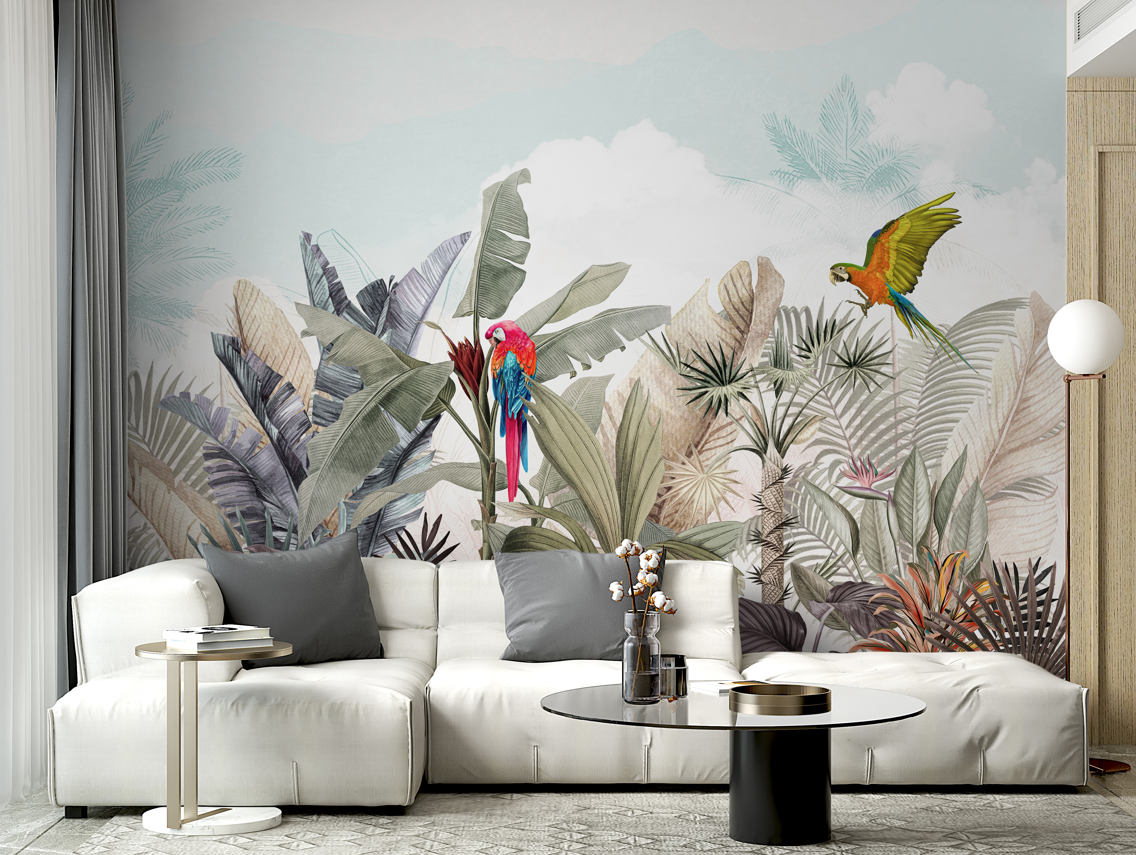 Lernen Sie Ihre neue Wandbesessenheit kennen: die Fototapete “Colorful Parrot Flying in the Air”. Es ist, als ob der Traum eines Vogelbeobachters direkt in Ihrem Wohnzimmer gelandet wäre! Stellen Sie sich zwei farbenfrohe Papageien vor, die über grünes Laub und tropische Blumen gleiten. Es ist wie ein Mini-Urlaub im Regenwald – nur ohne die Mücken, Gott sei Dank!