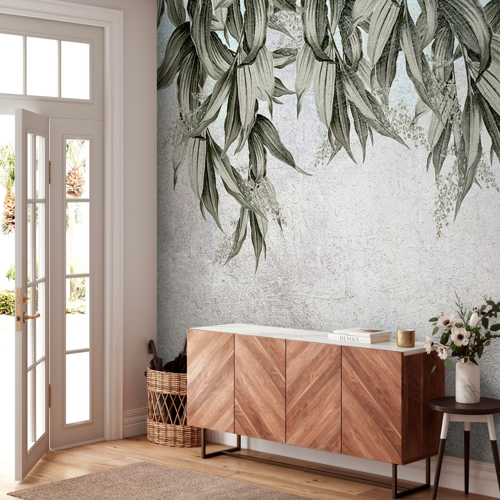 Verwandeln Sie triste Wände in eine heitere Oase mit dieser Fototapete mit hängenden Blättern auf einer dezent schattierten Wand. Stellen Sie sich vor, Sie betreten einen Raum, der sich anfühlt, als würde er von einer sanften Brise geküsst, in dem sich die Blätter sanft wiegen und tanzen und eine ruhige Stimmung verbreiten. Es ist perfekt, um eine Dschungel-Oase direkt in Ihrem Wohnraum zu schaffen. Ob in einer gemütlichen Ecke oder in einem geräumigen Wohnzimmer, dieses Wandbild sorgt für Entspannung und verleiht jeder Zusammenkunft eine besondere Note. Die schlichte Eleganz verleiht ihm einen zeitlosen Charme – wer würde nicht gerne einen Hauch von Natur im Haus haben? Es ist, als ob man sich einen schönen Garten ins Haus holt, nur ohne die Gießkanne!