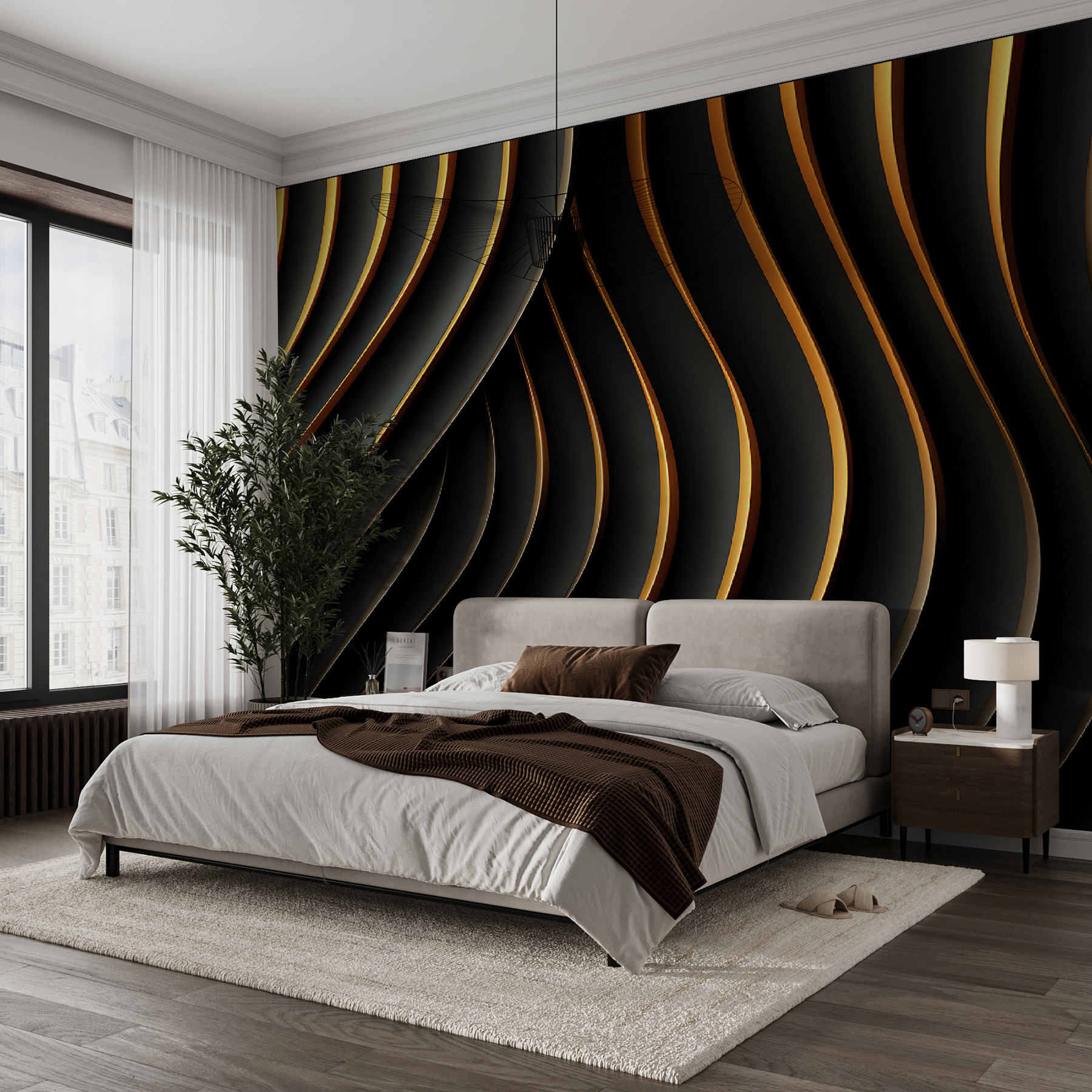 Verwandeln Sie jeden Raum mit diesem fesselnden Wandbild mit fließenden schwarzen und orangefarbenen geschwungenen Linien. Stellen Sie sich vor, Sie betreten Ihren Raum und spüren eine sofortige Energieverschiebung – es ist wie eine warme Umarmung durch Ihre Wände! Die dynamischen Muster laden zur Bewegung ein, tanzen sanft über die Oberfläche und ziehen Sie in ihren Bann. Perfekt für ein modernes Ambiente, kann es einen langweiligen Raum in einen trendigen Treffpunkt verwandeln. Stellen Sie sich eine gemütliche Ecke mit einer Tasse Kaffee vor, mit diesem auffälligen Wandbild im Hintergrund, das Ihre Kreativität anregt. Es ist nicht einfach nur eine Tapete, sondern ein Erlebnis, das auf Sie wartet. Machen Sie sich bereit, zu beeindrucken!