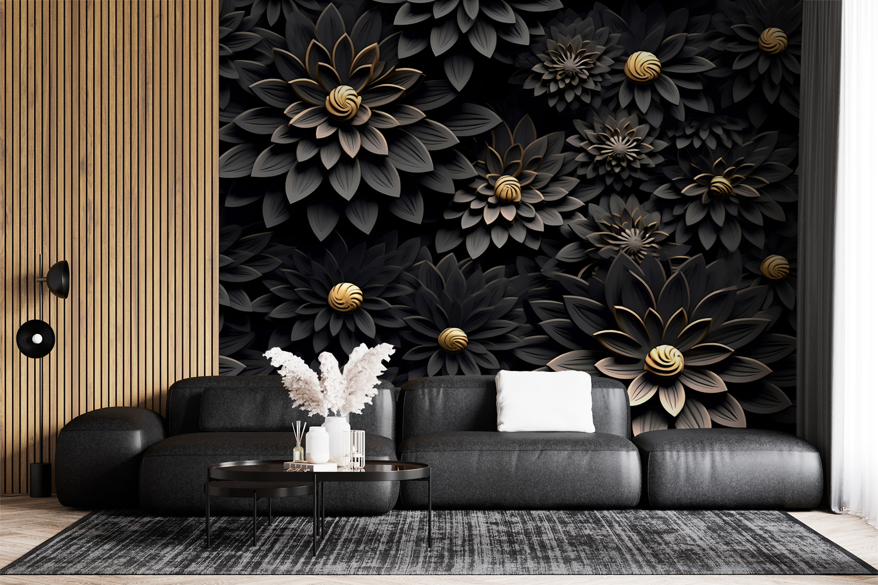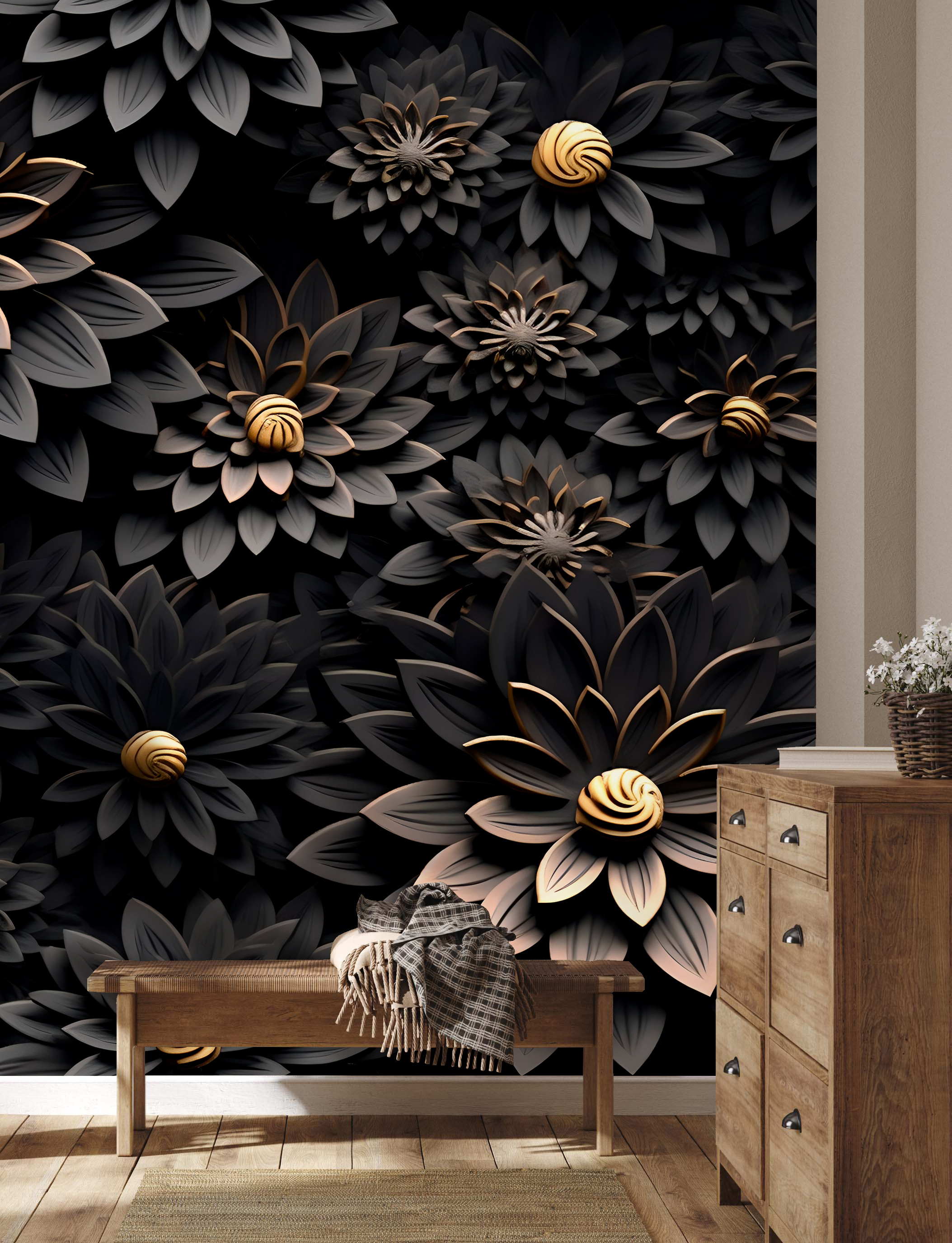 Verwandeln Sie Ihren Raum mit dieser atemberaubenden Fototapete mit metallischen Blumen auf dunklem Hintergrund. Es ist, als würde man ein kleines Stück eines zauberhaften Gartens ins Haus holen – perfekt, um Gespräche anzuregen oder einfach nur an einem faulen Nachmittag zu träumen. Stellen Sie sich vor: Sie haben es sich mit einem guten Buch gemütlich gemacht und lassen sich von der Schönheit der Blumen umarmen. Die floralen Muster heben sich von den tiefen Tönen ab und verleihen jedem Raum eine faszinierende Tiefe. Es ist nicht nur Dekoration, es ist ein Erlebnis. Stellen Sie sich vor, Ihre Freunde kämen herein, lächelten und spürten sofort diese schöne Atmosphäre. Dieses Wandbild ist eine perfekte Mischung aus Eleganz und einem Hauch von Dramatik und verwandelt jede Wand in ein Statement und einen fröhlichen Rückzugsort.
