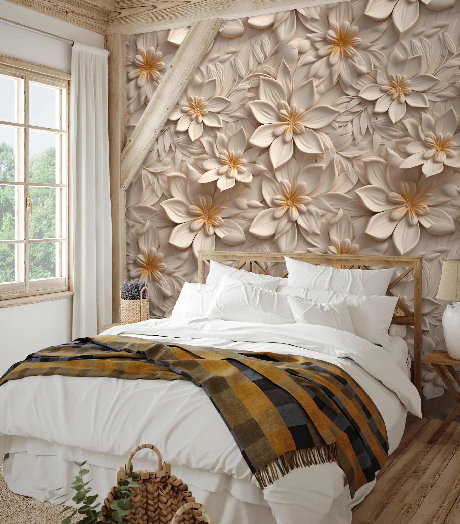 Verwandeln Sie jeden Raum in einen ruhigen Rückzugsort mit dieser atemberaubenden Fototapete, die ein kompliziertes Blumenmuster in beruhigendem Beige zeigt. Stellen Sie sich vor, Sie betreten einen Raum, in dem jeder Blick auf zarte Blütenblätter und sanfte Blattmotive fällt – es ist, als hätten Sie einen Garten im Haus, nur ohne die lästigen Pollen. Freunde könnten sich vorbeugen, um die Details zu bewundern, oder vielleicht werden sie einfach nur neidisch seufzen. Stellen Sie sich vor, Sie machen es sich mit einem Buch gemütlich oder schlürfen einen Tee, umgeben von dieser friedlichen Atmosphäre. Das ist nicht nur Dekoration, sondern ein Hauch von frischer Luft, der Wärme und Gemütlichkeit ins Haus bringt. Lassen Sie sich von der Glückseligkeit anstecken!