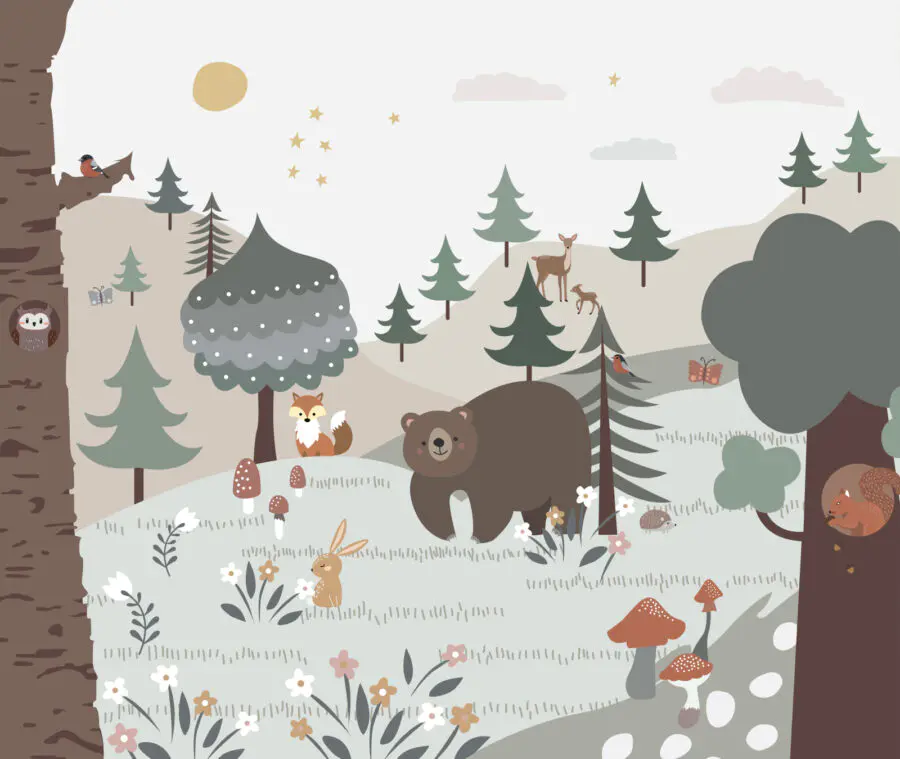 Dieses skurrile Wald-Wandbild verleiht dem Kinderzimmer einen magischen Touch! Es zeigt entzückende Tiere wie verspielte Bären, neugierige Füchse und scheue Rehe, die durch einen ruhigen Wald wandern – die perfekte Kulisse, um der Fantasie freien Lauf zu lassen. Die sanften Farben und die bezaubernden Illustrationen sorgen für ein gemütliches, verträumtes Gefühl, als würde man in ein Märchenbuch eintauchen. Stellen Sie sich vor, wie Ihr Kind mit diesen liebenswerten Figuren in den Schlaf fällt. Dieses Wandbild ist eine perfekte Ergänzung zu den langweiligen, leeren Wänden und bringt einen Hauch von Waldzauber ins Haus. Jeder Blick auf dieses Wandbild könnte eine Gute-Nacht-Geschichte auslösen oder zu einem neuen Abenteuer inspirieren. Diese Fototapete ist nicht nur eine Dekoration – sie ist ein wunderliches Fenster zu endlosen Geschichten und Träumen! Perfekt für jedes Kinderzimmer, in dem die Träume fliegen und die Fantasie blüht.