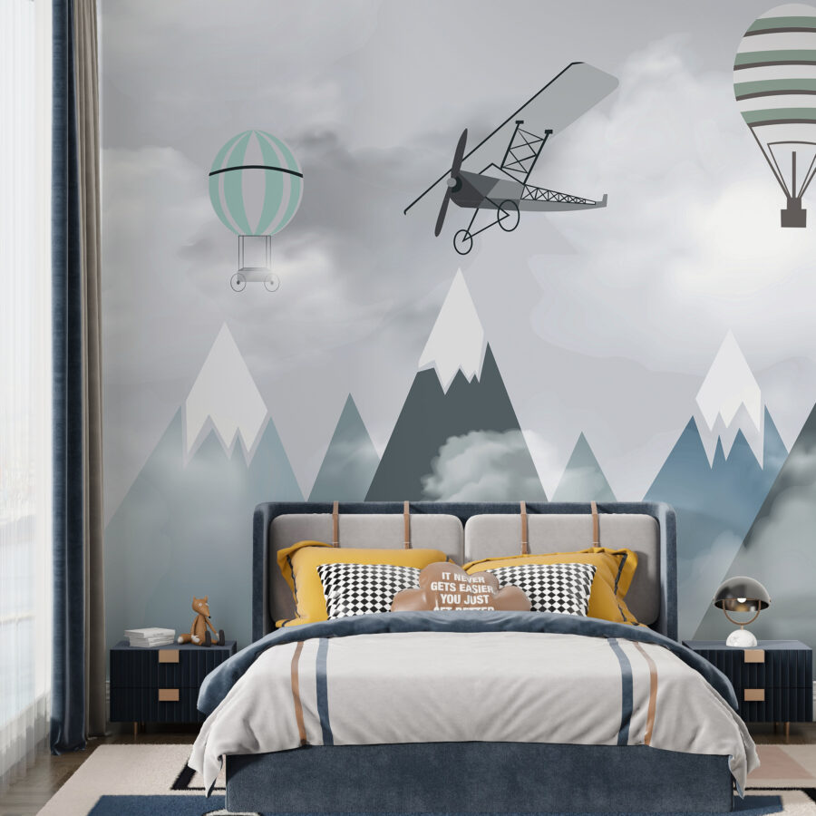Stellen Sie sich vor, wie sich das Zimmer Ihres Kindes in ein traumhaftes Abenteuer in luftiger Höhe verwandelt – mit dieser bezaubernden Wandmalerei “Flugzeuge und Ballons über den Bergen”. Es ist, als würde man in ein Märchenbuch eintauchen, in dem skurrile Flugzeuge und Heißluftballons träge über heitere Berggipfel schweben. Dieses Wandbild ist perfekt für Ihren kleinen Flieger oder aufstrebenden Entdecker, denn es weckt das Gefühl für Wunder und unendliche Möglichkeiten.