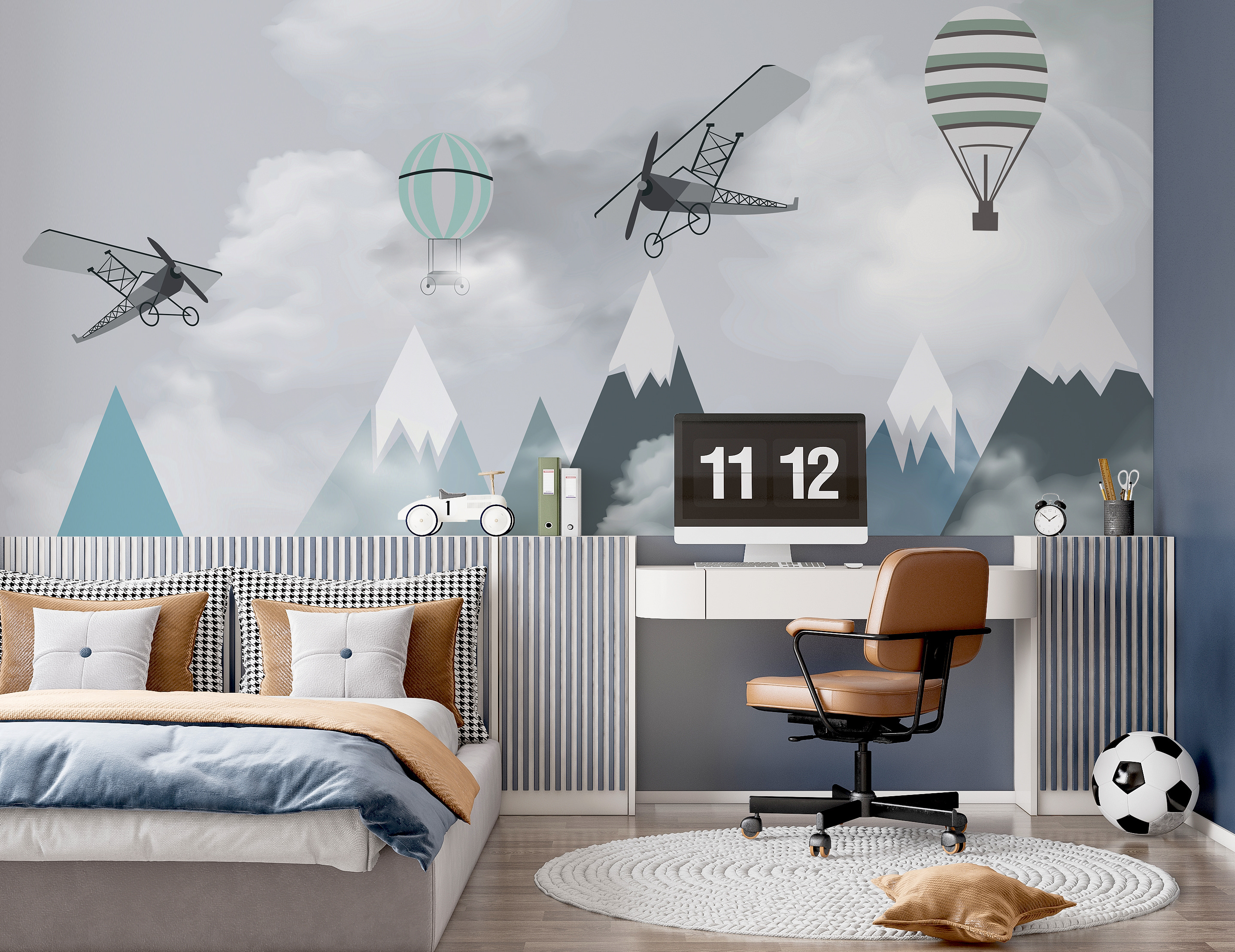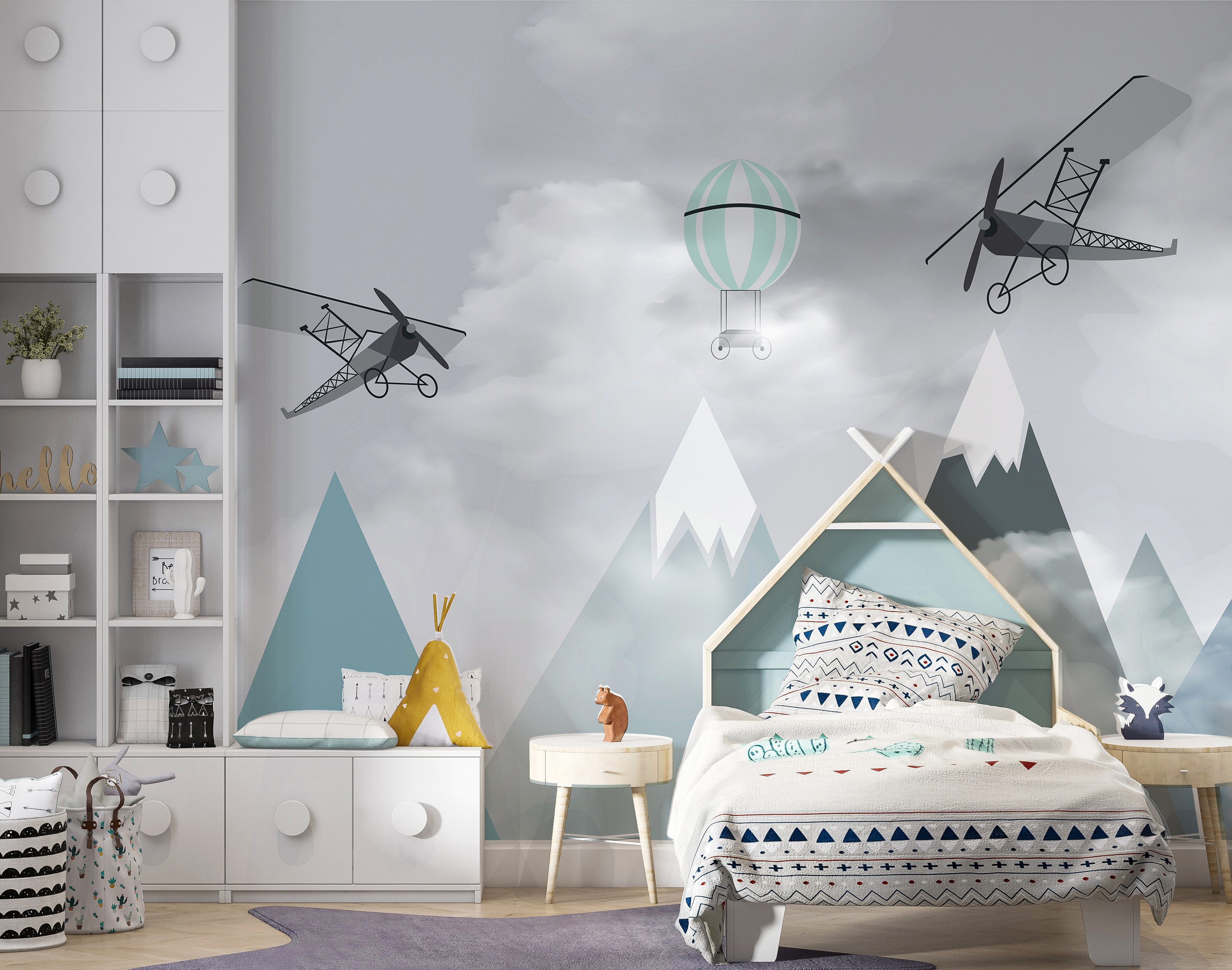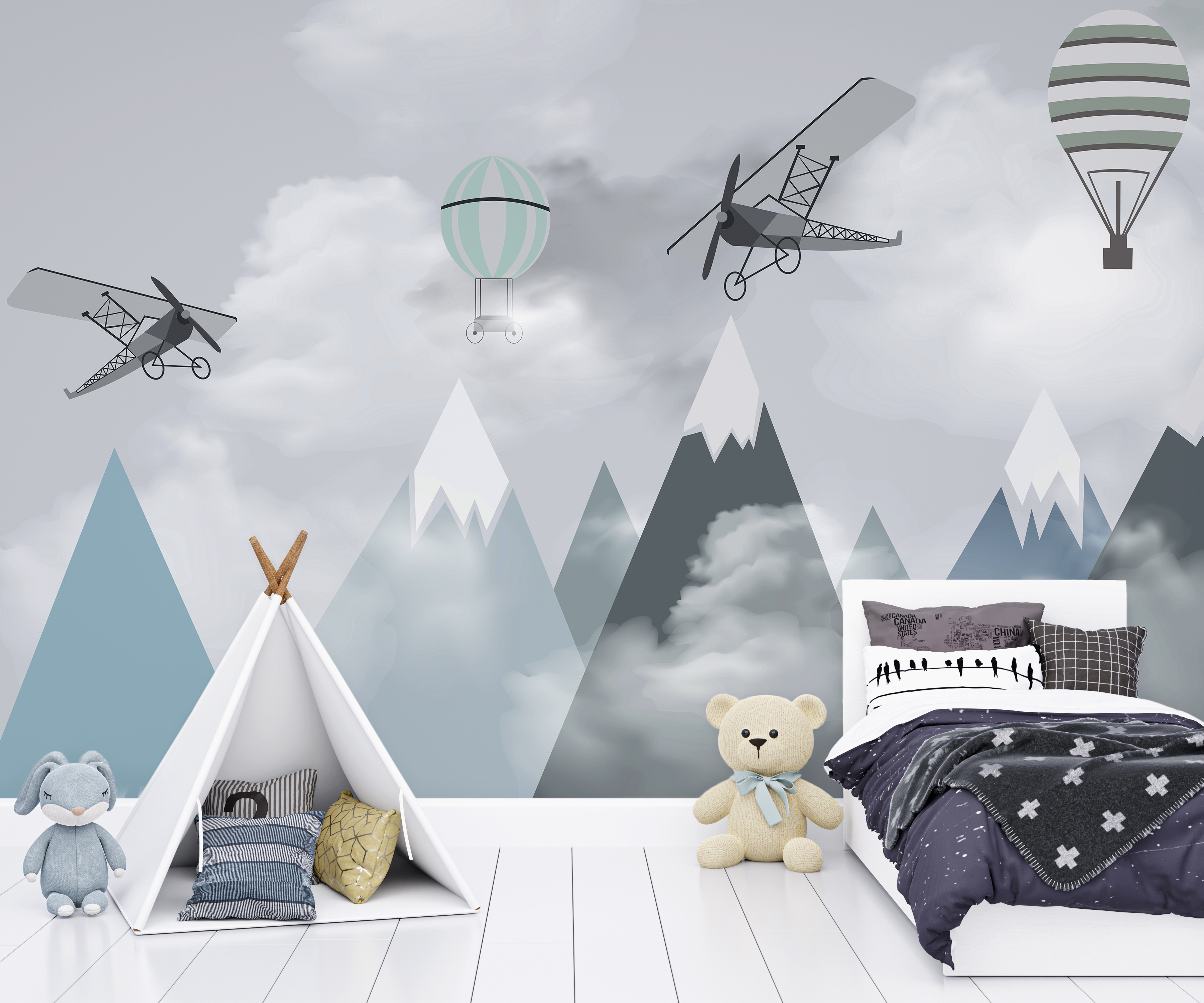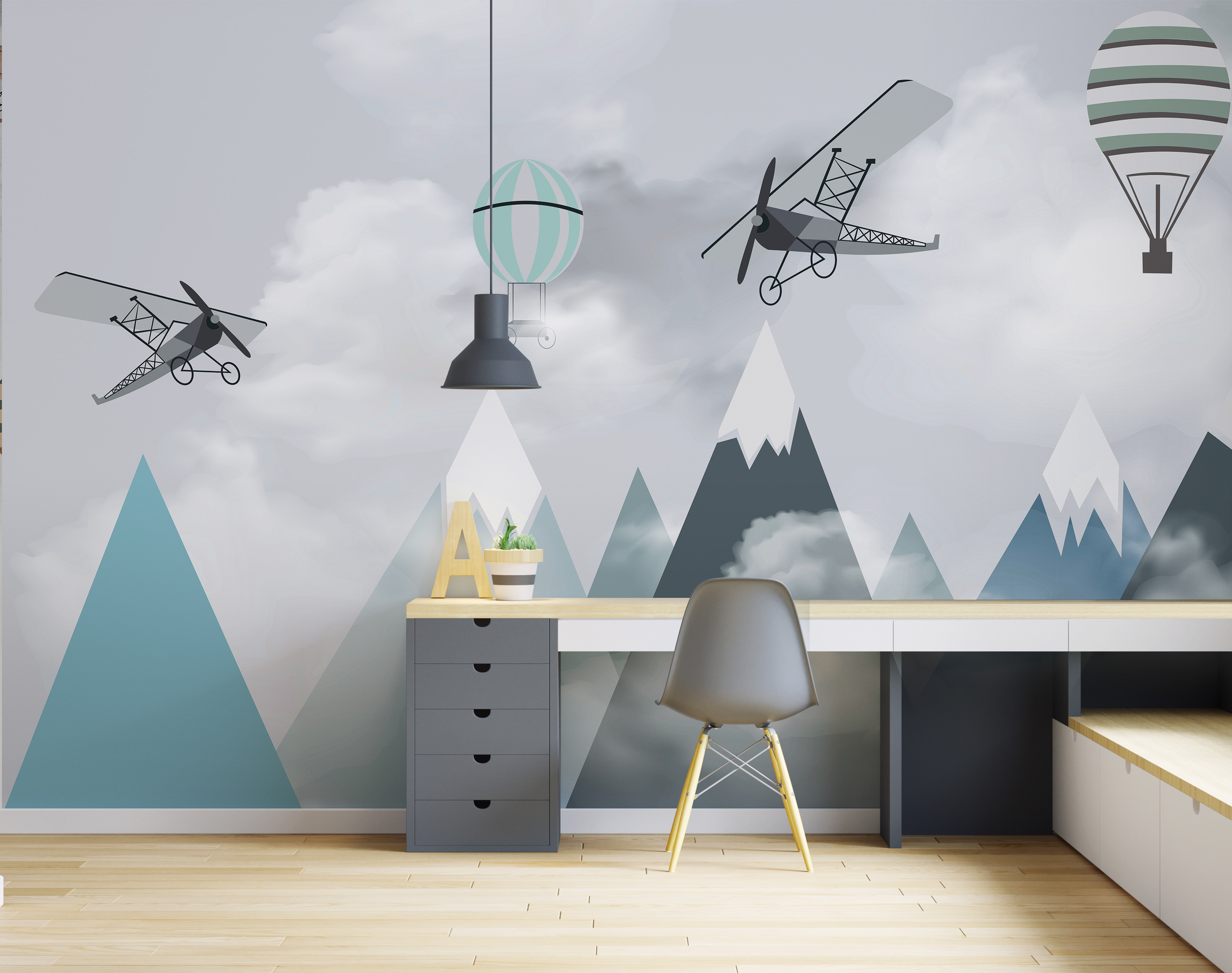 Stellen Sie sich vor, wie sich das Zimmer Ihres Kindes in ein traumhaftes Abenteuer in luftiger Höhe verwandelt – mit dieser bezaubernden Wandmalerei “Flugzeuge und Ballons über den Bergen”. Es ist, als würde man in ein Märchenbuch eintauchen, in dem skurrile Flugzeuge und Heißluftballons träge über heitere Berggipfel schweben. Dieses Wandbild ist perfekt für Ihren kleinen Flieger oder aufstrebenden Entdecker, denn es weckt das Gefühl für Wunder und unendliche Möglichkeiten.