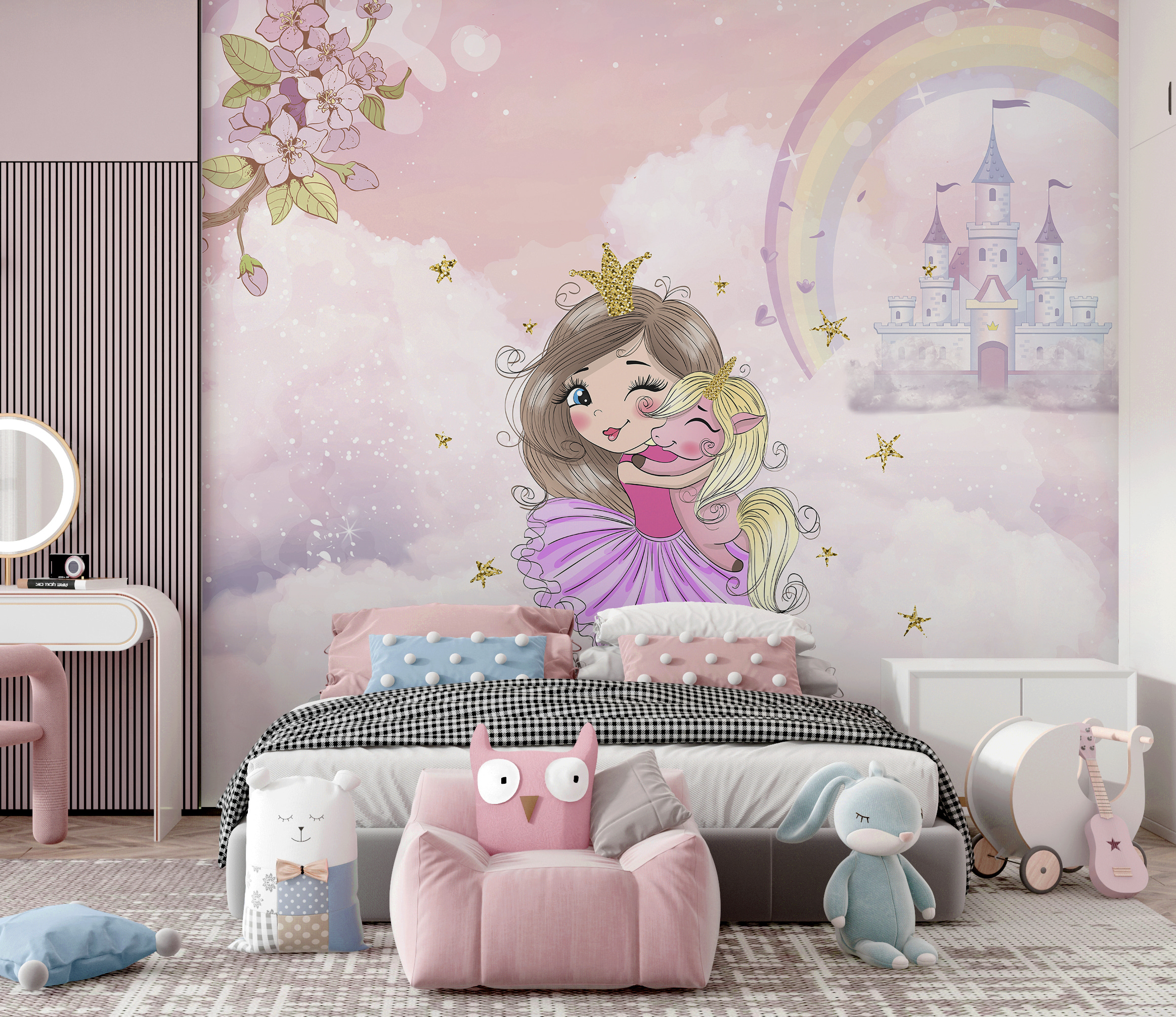 Diese Fototapete ist ein wahrer Zauber für jedes Kinderzimmer! Stellen Sie sich eine Szene wie aus einem Märchen vor: ein süßes Mädchen, das das flauschigste Einhorn herzlich umarmt. Die Pastellfarben, die glitzernden Sterne und das verträumte Schloss unter dem Regenbogen – ehrlich gesagt, es ist, als würde man in ein Märchenbuch eintreten. Perfekt, um ein Lächeln und endlose Tagträume hervorzurufen. Außerdem verleiht es dem Zimmer eine weiche, sanfte Ausstrahlung, die einfach bezaubernd ist. Stellen Sie sich einfach vor, wie Ihr Kind jeden Tag in dieser wunderlichen Welt aufwacht – das wird den Morgen noch ein bisschen magischer machen.