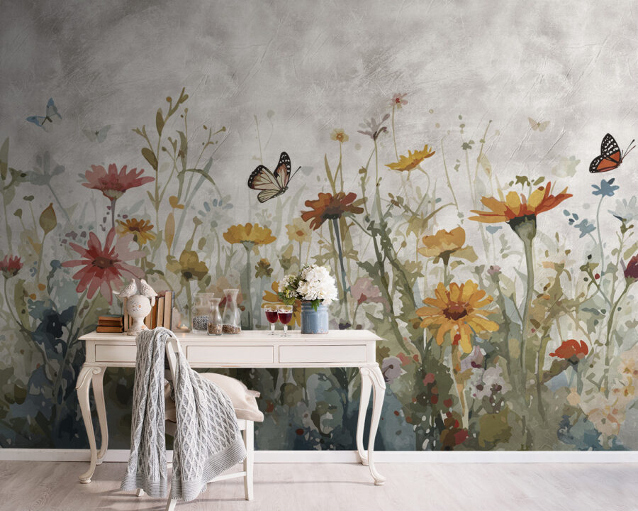 Haben Sie Lust, Ihren Raum zu verschönern? Schauen Sie sich diese entzückende Fototapete “Schmetterlinge tanzen über einer bunten Wiese” an. Es ist, als hätte jemand die Freude eines sonnigen Tages auf einer Wildblumenwiese in Flaschen abgefüllt und direkt an Ihre Wand gespritzt! Die Schmetterlinge, die über den leuchtenden Blüten schweben, sind das pure Glück – perfekt für alle, die ein bisschen Magie der Natur in ihren Innenräumen gebrauchen können.