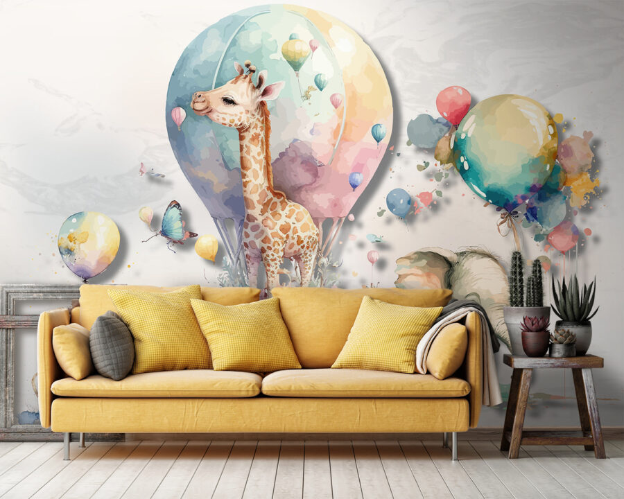 Verwandeln Sie jeden Raum mit dem bezaubernden Wandbild “Watercolor of a Lion”! Dieses entzückende Kunstwerk zeigt ein bezauberndes Löwenbaby, eine anmutige Giraffe, die in einem Heißluftballon schwebt, und einen entzückenden Elefanten, der bunte Luftballons hält – alles in weichen, verträumten Aquarellfarben gemalt. Es ist perfekt, um Kinderzimmern, Spielbereichen oder anderen Orten, die einen Hauch von Magie brauchen, einen Hauch von Laune zu verleihen.